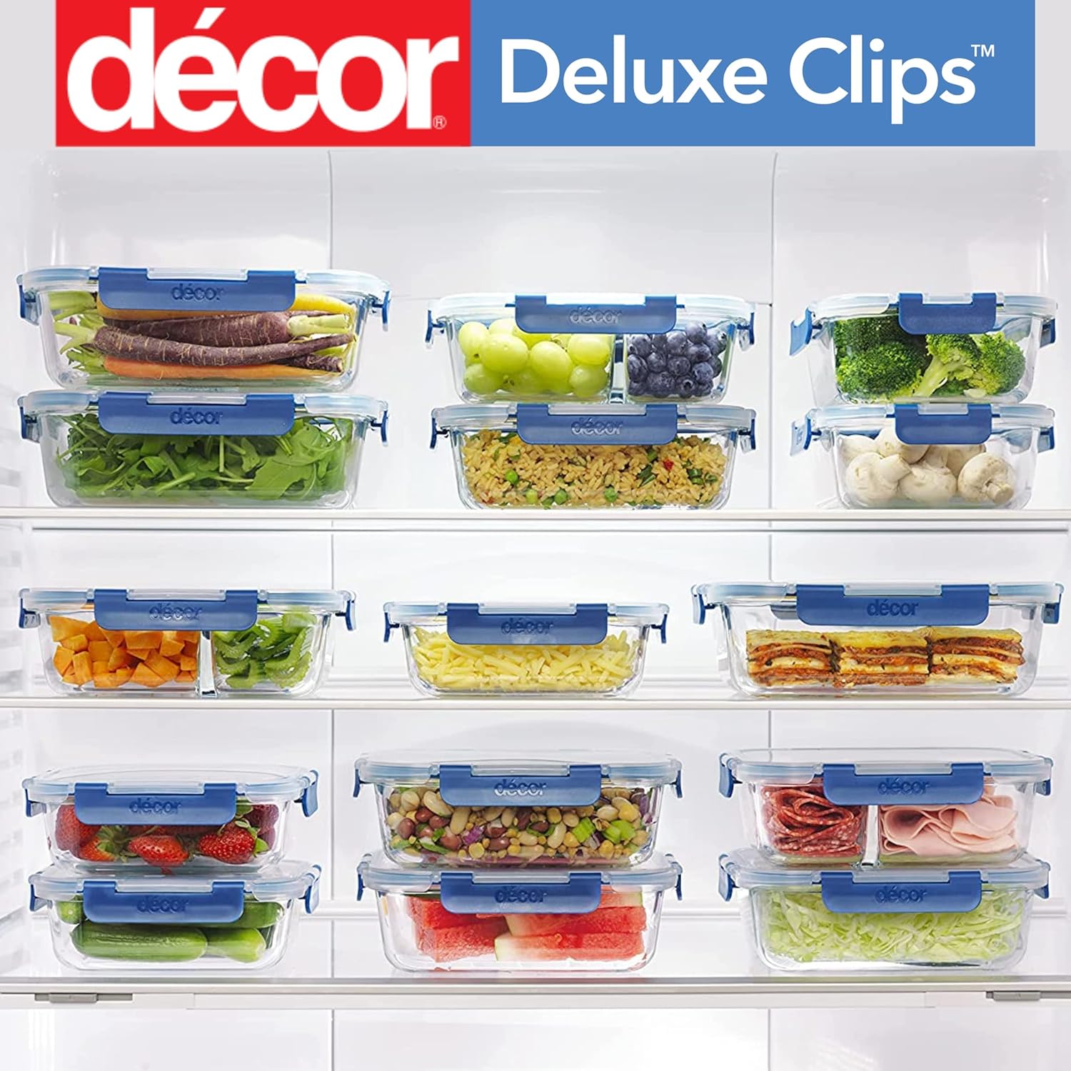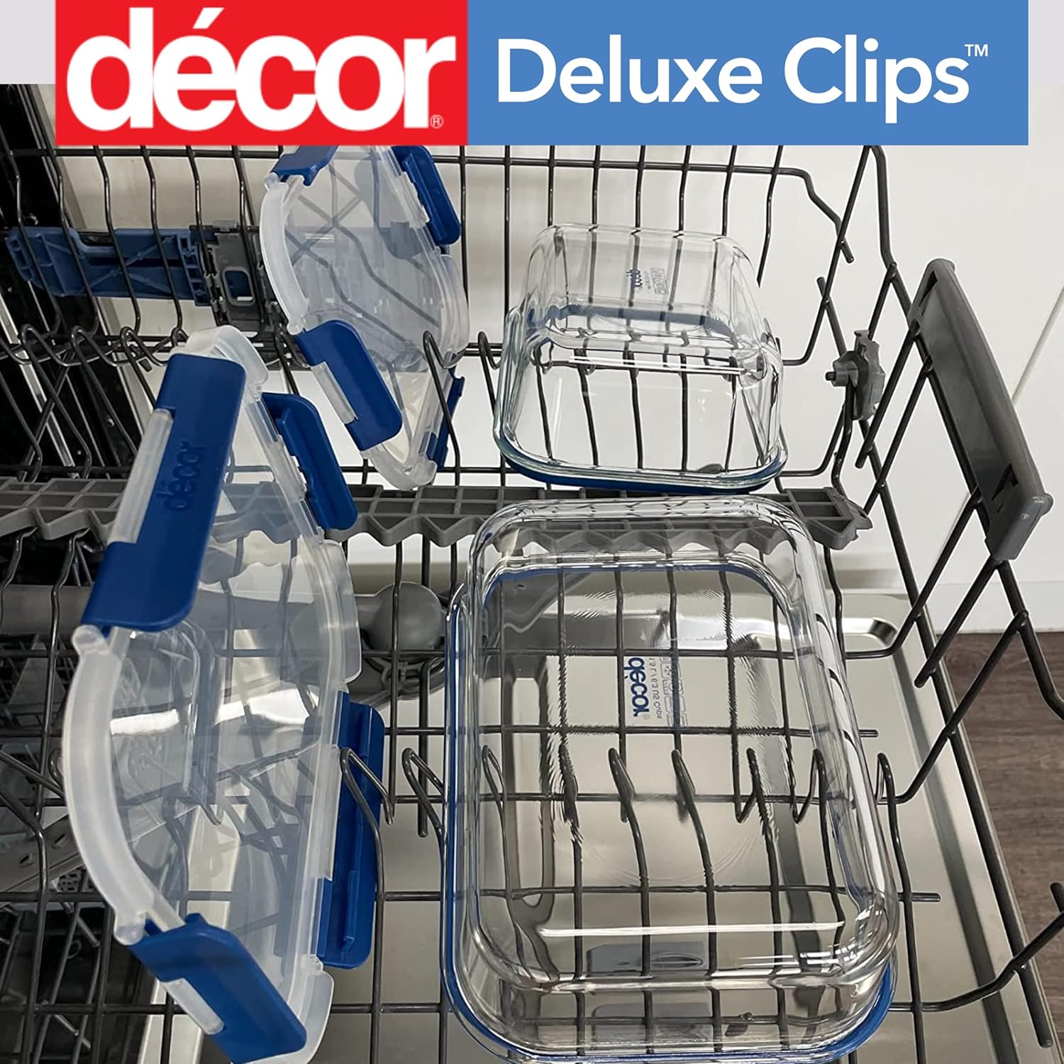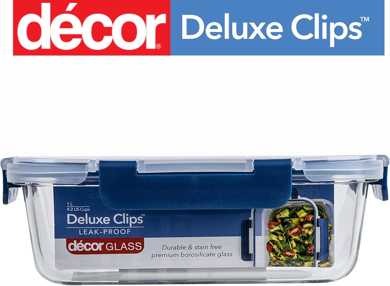 Décor Deluxe Clips Glass Food Storage Container | Leakproof Lid with Deluxe Clips | Dishwasher, Freezer & Microwave Safe – 1L Capacity