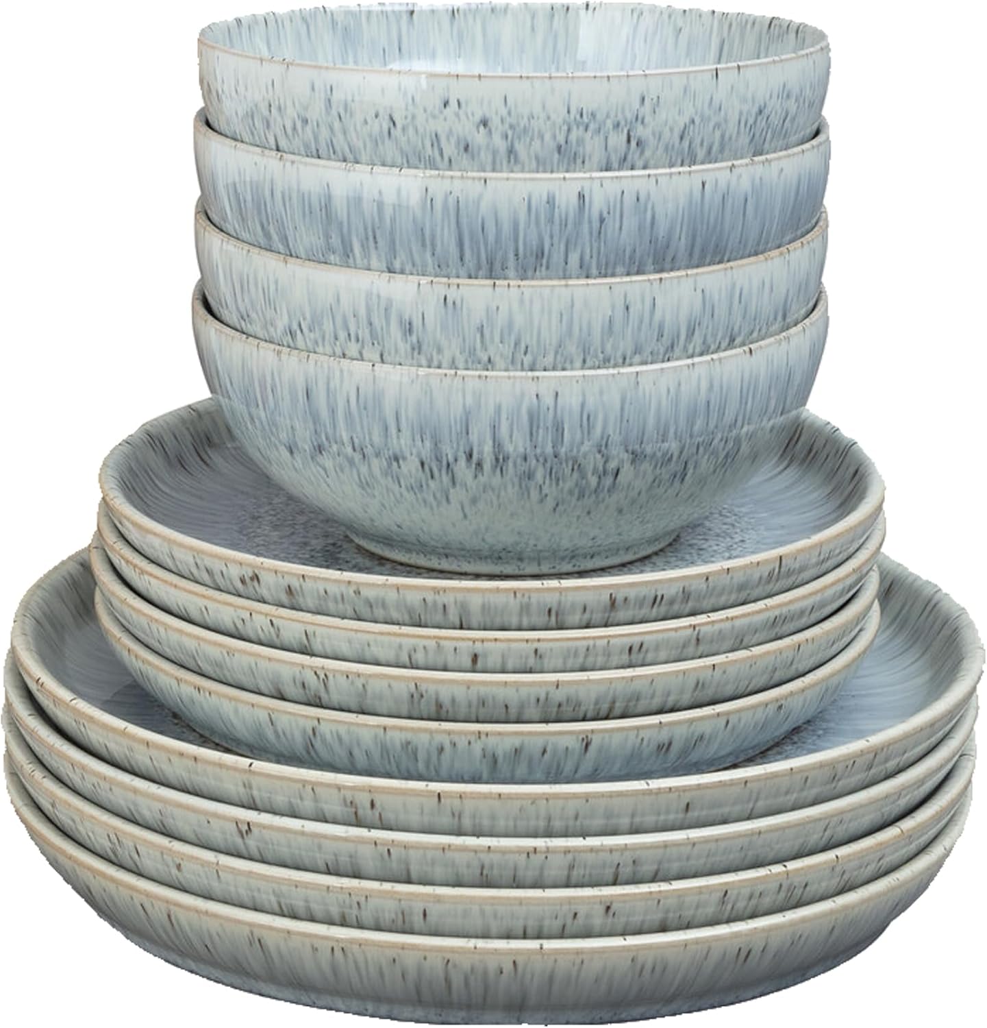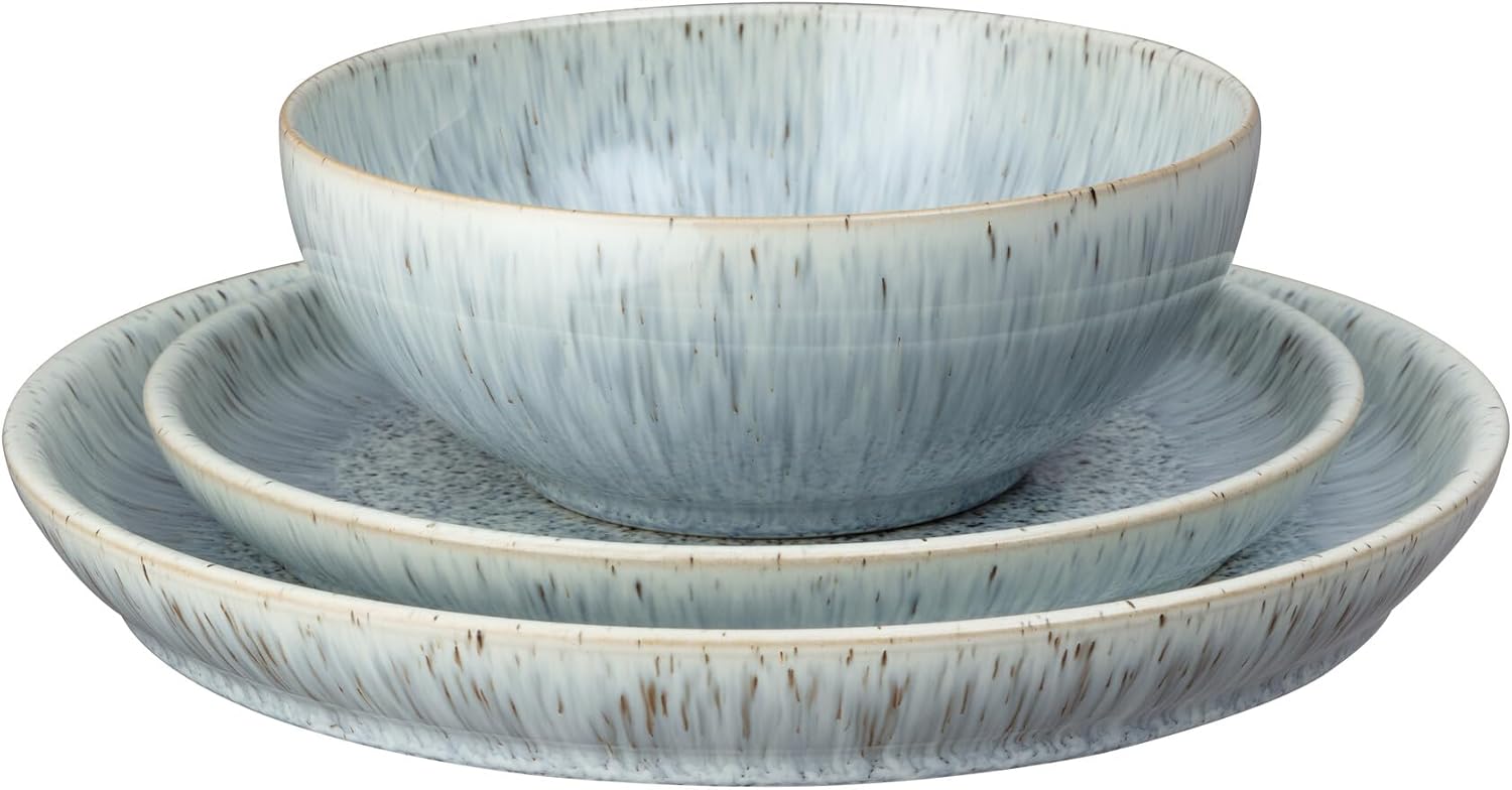12 PIECE DINING SET FOR 4: This 12 piece dinner set for 4 includes 4 coupe dinner plates (26cm x 26cm x 3cm), 4 medium coupe plates (21cm x 21cm x 2.5cm) and 4 cereal bowls (17cm x 17cm x 6.5cm, 820ml capacity) – The Denby Halo Speckle collection is perfect for any ocassion from everyday dining to formal events