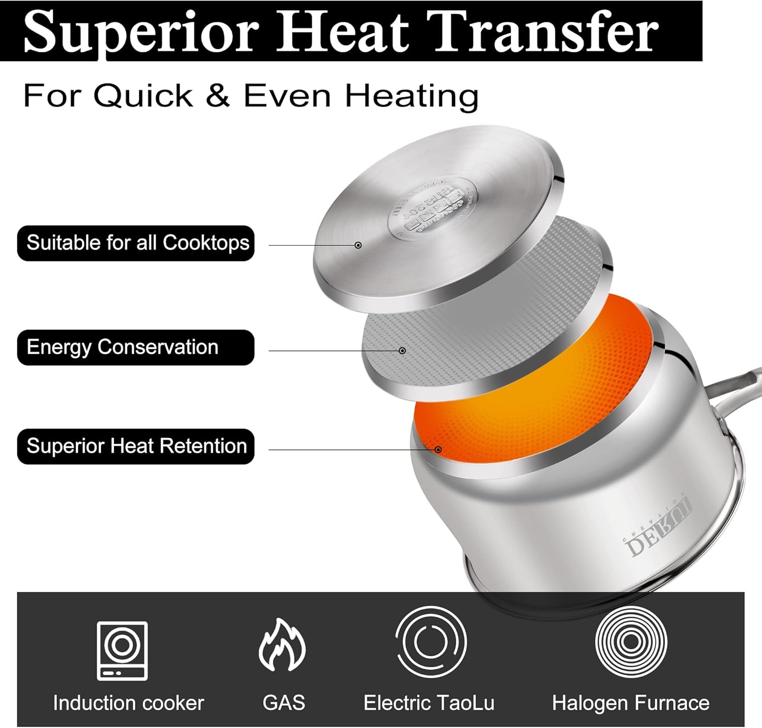Encapsulated bottom with aluminum core for even heat distribution, It WILL NOT come into contact with your food.Ensures optimal heat distribution and heat storage.