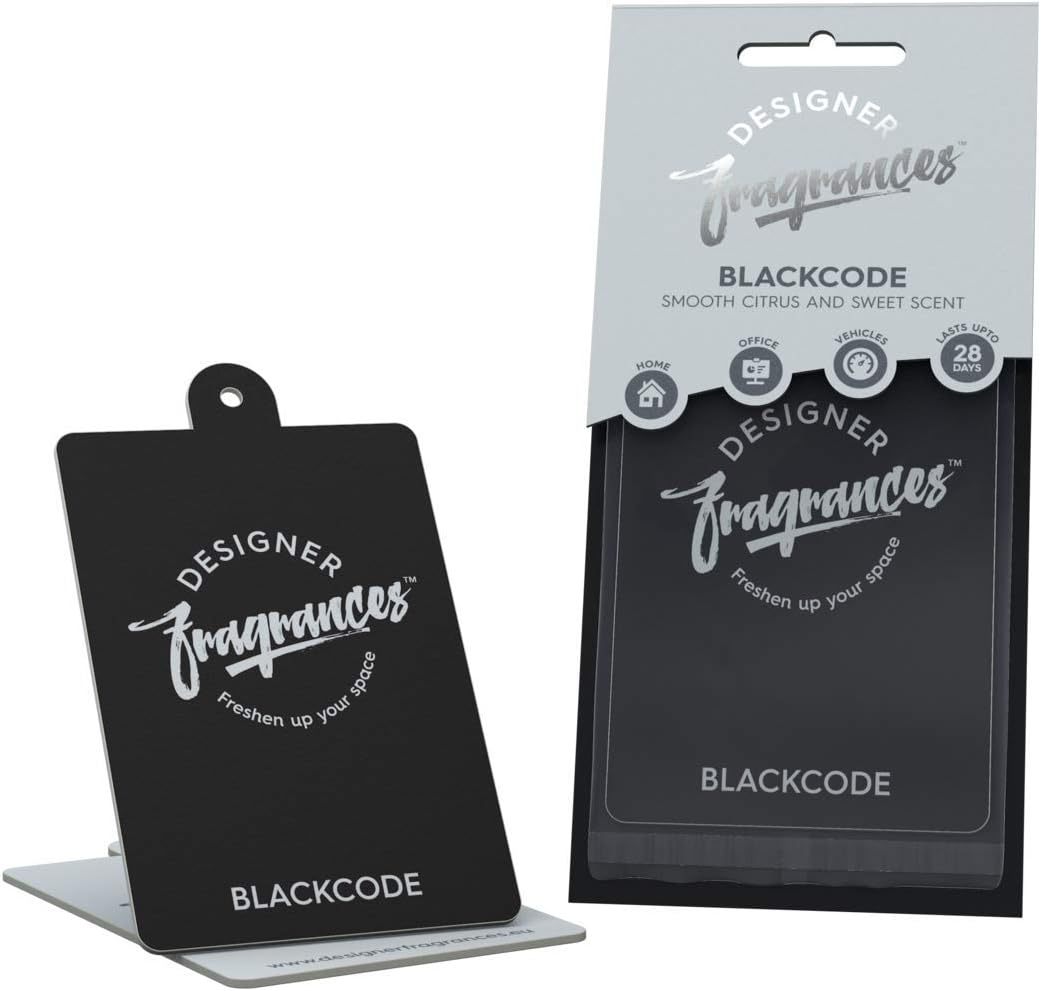 Designer Fragrances Black Code Air Fresheners inspired by market-leading perfumes. Made using natural perfume oils. It smells just like a premium fragrance. Top notes of tobacco and wood. Base scents of leather, citrus and spice. It comes in a 4mm thick card with 5 grams of oil to ensure longevity up to 28 days.