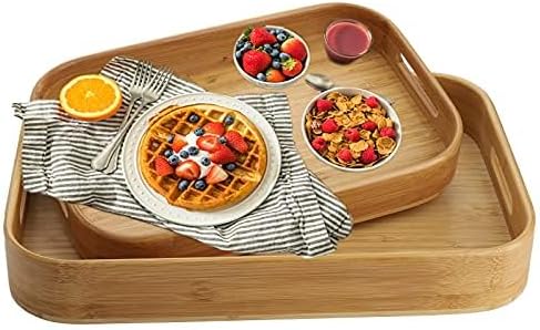 Dicunoy Set of 2 Bamboo Serving Tray, Solid Wood Breakfast Tray with Handles, Large Bamboo Food Tray Great for Breakfast, Tea, Coffee, Bar, Parties, 39cm L x 27cm W /32cm L x 22cm W