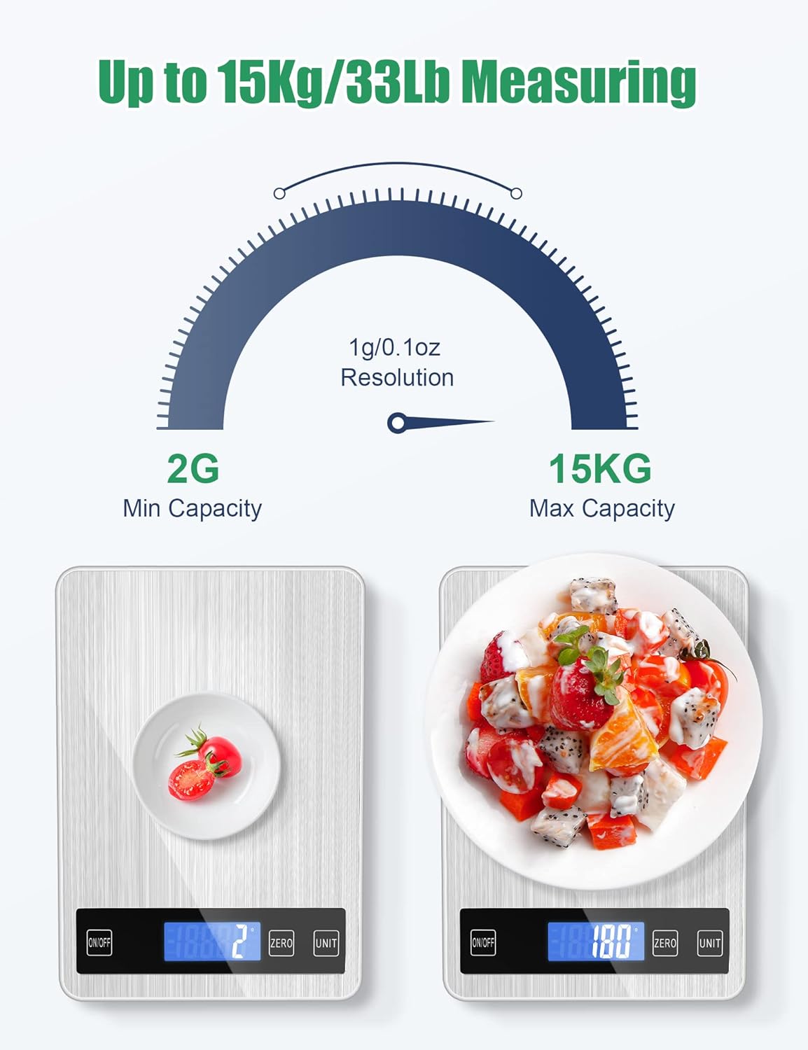 【Accurate Measurement Food Scales】Digital kitchen scales equips four high-precision load sensors technology to give you accurate measurements all the time. kitchen scales digital can quick and accurate 0.03oz/1g increments when adding food ingredients. Measuring range: 0.1 oz to 33 lbs (3g to 15kg). Its meet your needs for measuring different things such as: fruit, vegetables, weighing meat, grains, liquids, milk, jewelry, coffee, espresso, powder and ingredients etc.