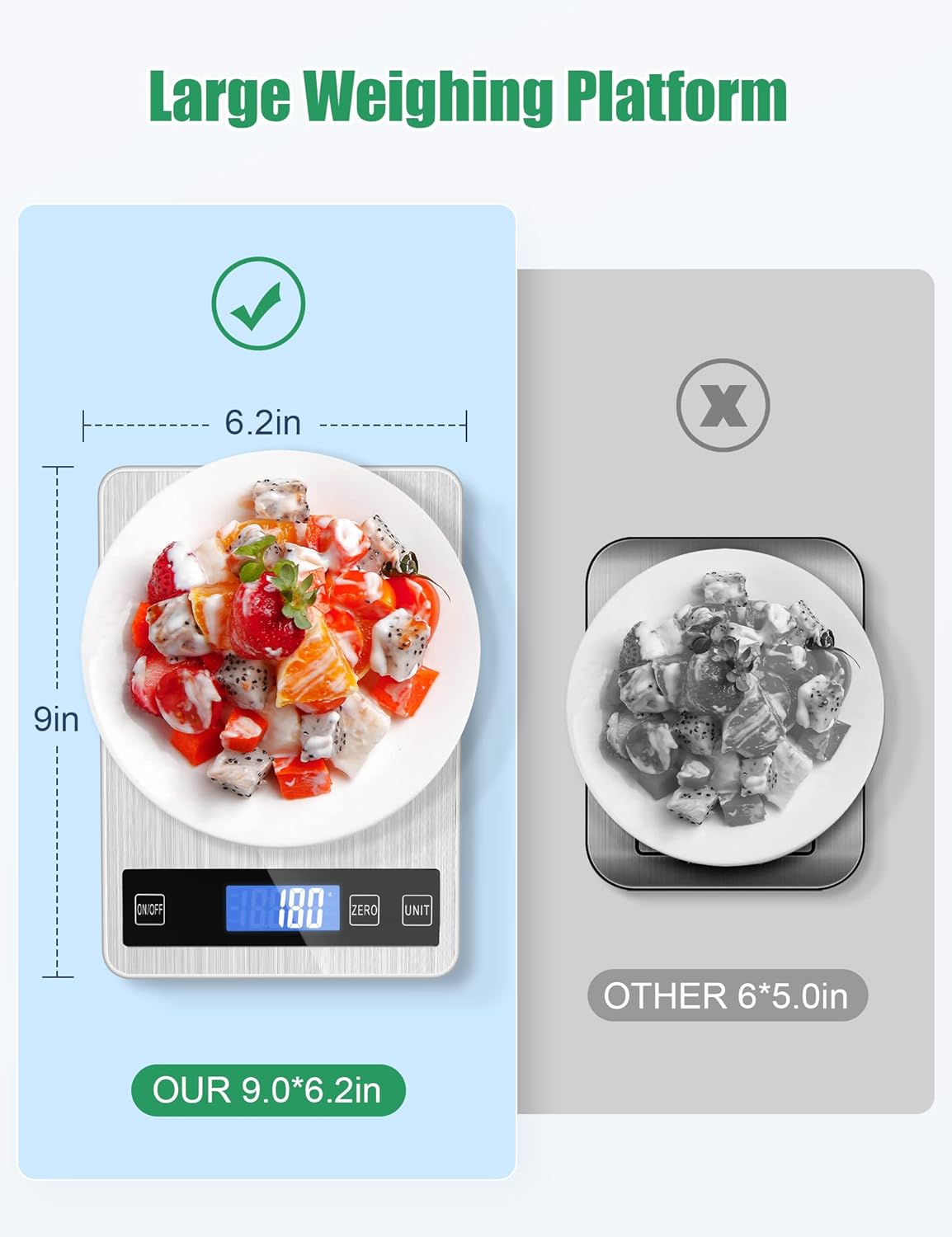The food weighing scales digital has a negative white digital display, easy to read weight measurement from any angle and in all light conditions, even in the dark.