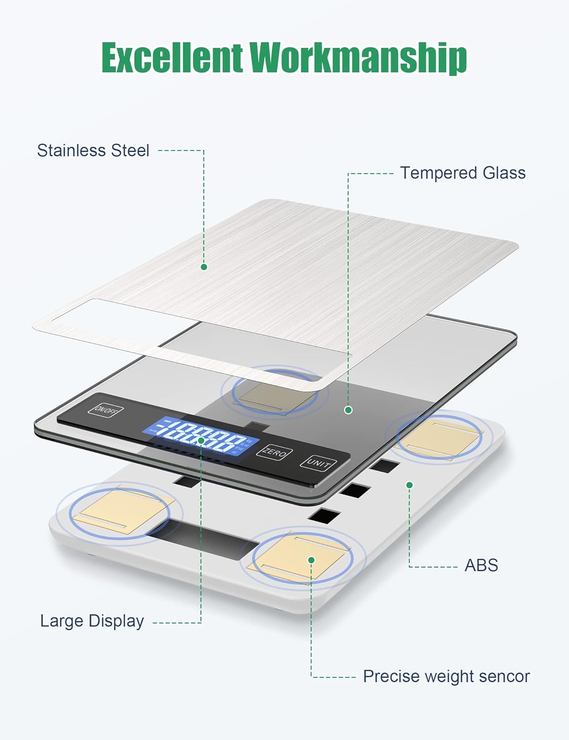 The waterproof food scales is made of premium quality stainless steel, tempered glass and ABS plastic. Durable, easy to clean and maintenance. It is helping to creat a healthier cooking environment and providing you great using experience.