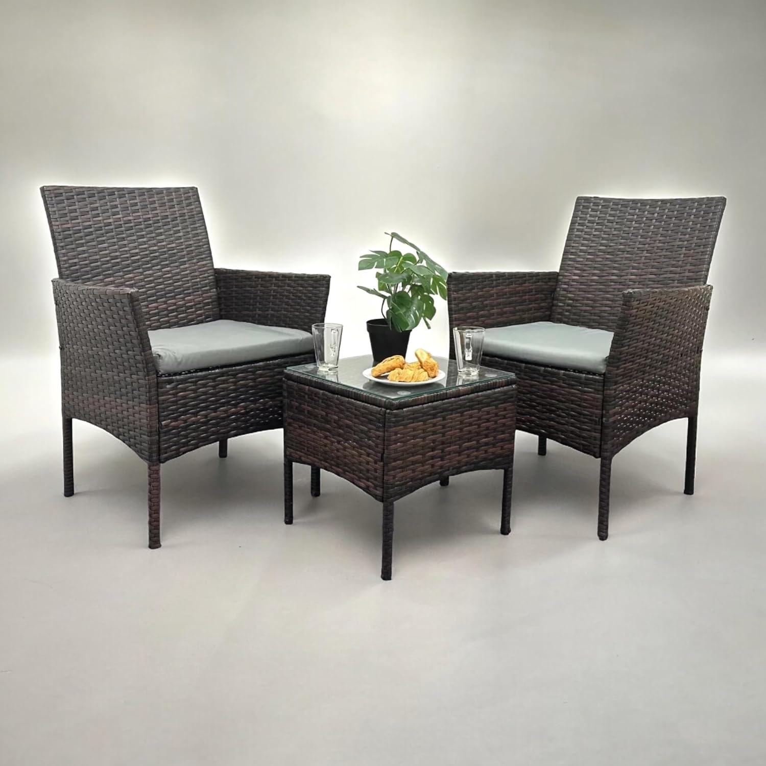 Versatile Set: Comprising a glass-top coffee table and two cushioned chairs, this rattan bistro set is perfect for patios, balconies, or gardens.