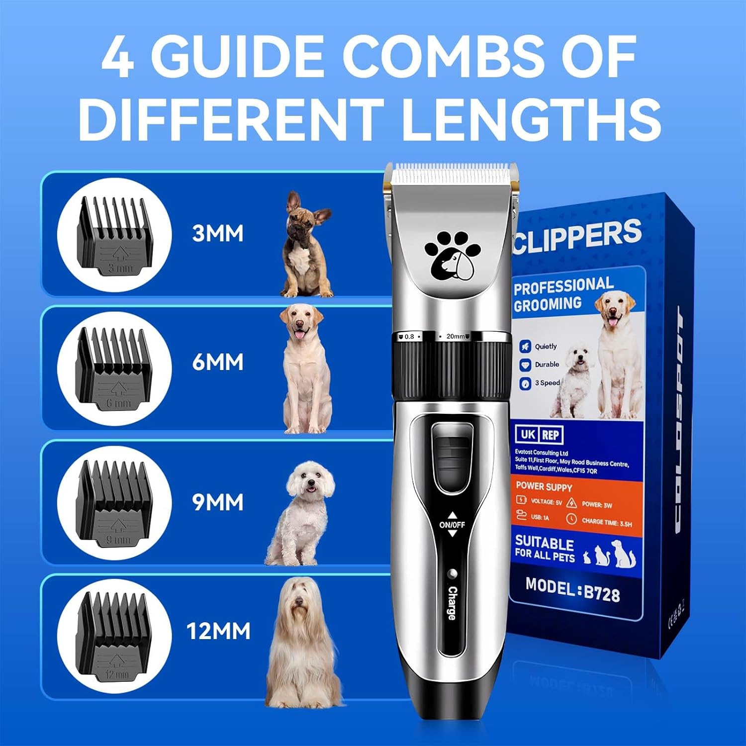 Dog Clippers for Grooming and Dog Paw Trimmer: DOG CLIPPERS are designed for trimming dog hair, effortlessly handling various breeds and hair types, ensuring a professional and neat trimming effect. Equipped with 3/6/9/12 four limit combs, it can easily trim the fur of beloved pets in a professional and tidy manner, suitable for all household pets such as rabbits, cats, and other long-haired pets.