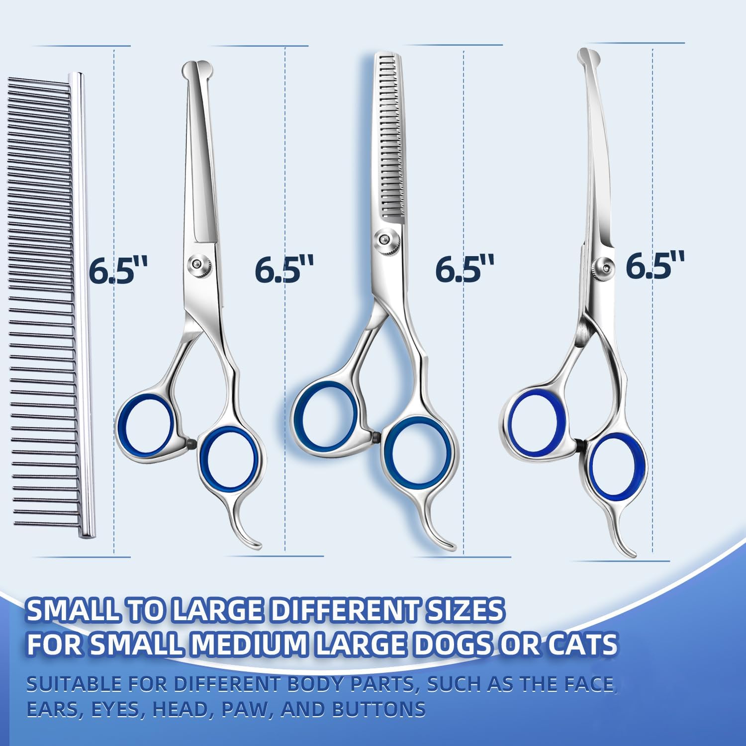 【Premium Material】All Shears and grooming combs are made with heavy duty Stainless Steel, Coated Titanium and Cold treatment for hardness, durability and style; The blade of scissors is very smooth, sharp and durable without rusting.