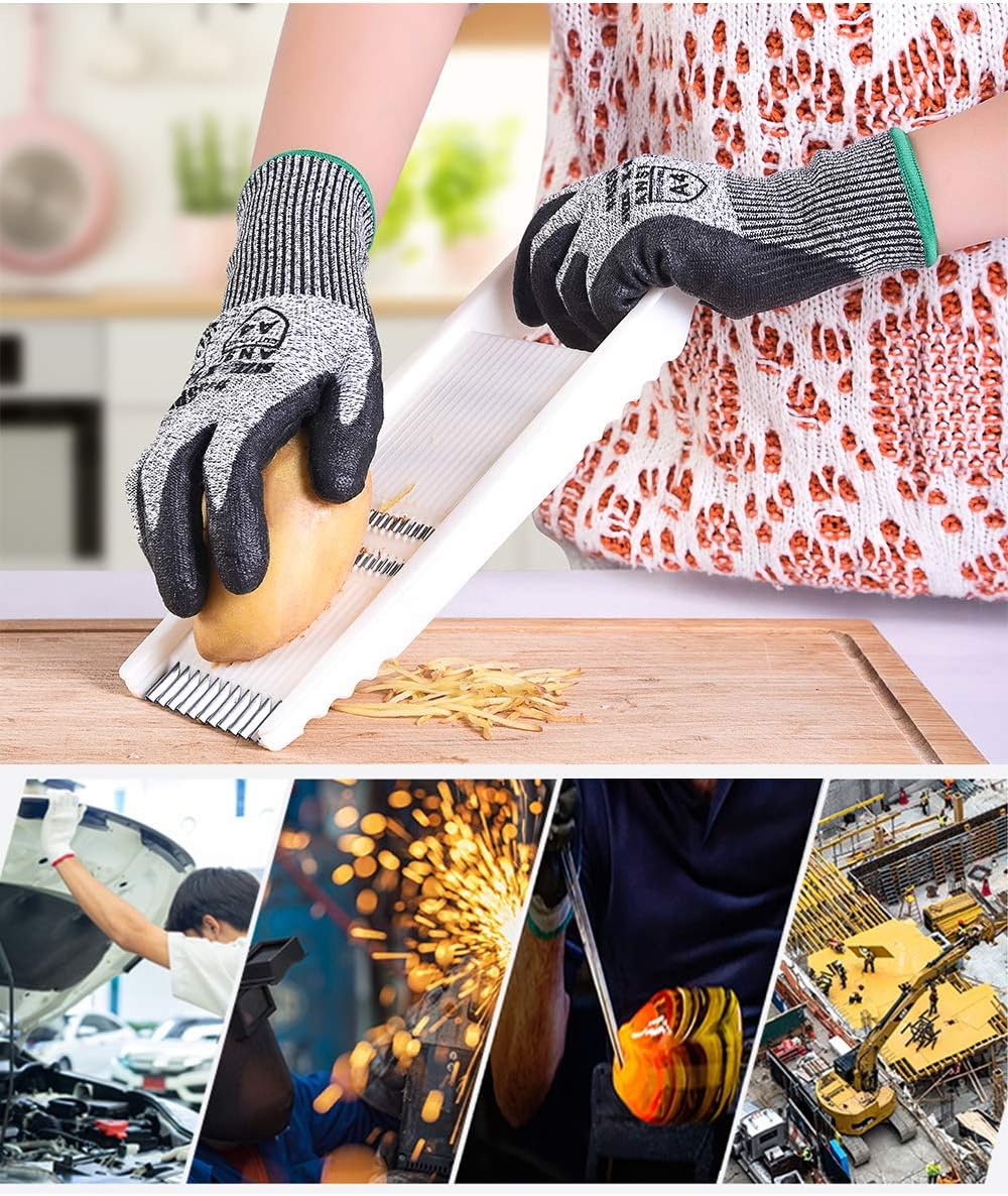 🔨【Professional protecting and flexibility】1Pair anti-cutting gloves give you EN388(Level 5)cut resistance,which is more than 10 times that of ordinary work gloves and more than 4 times that of leather gloves.The high performance cut resistant material HPPE is very light,so it is ideal for precision tasks where the worker needs feel and dexterity with what they are doing.