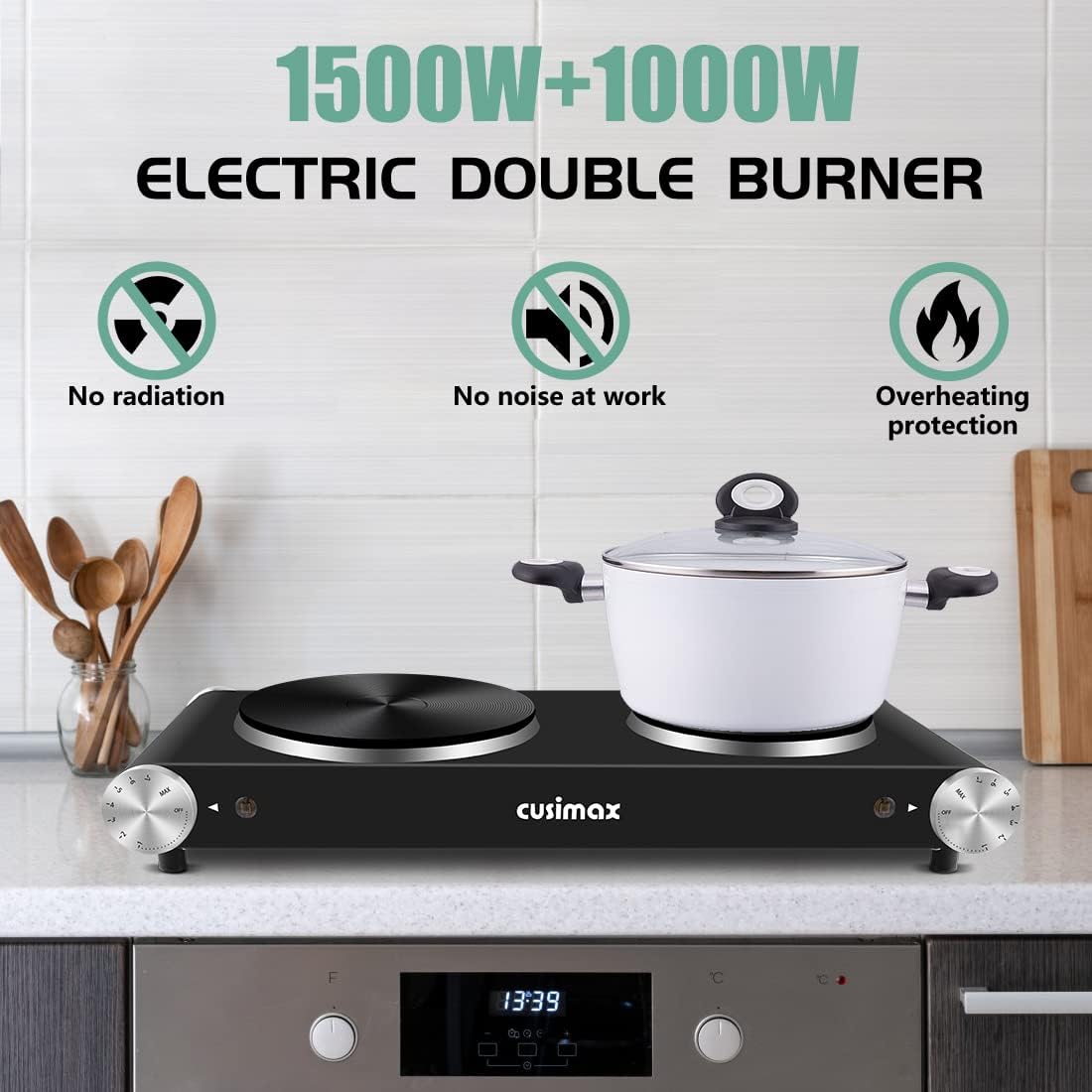 Double Hot Plate, CUSIMAX Electric Burner, 2500W Portable Electric Hob Hot Plates for Cooking With 2 Cast Iron Rings, Table Top Hob With Heating Plates, Compatible for All Cookwares, Black Cusimax electric double hob compatible with pots and pans with maximum size of 18.8cm 15.49cm. Composed of two solid cast iron heating rings. Unlike induction cooker, our electric hob is compatible with all types of cookwares, such as frying pans, steak plates, aluminum cookware, stainless steel cookware, glass cookware, ceramic cookware and more. Equipped with 1500W and 1000W heating elements can meet your daily cooking needs. For example, frying steak, cooking pasta, boiling water or tea, making thick soup and vegetables, and even use it to keep food warm during winter, making various delicious foods easily. Thermostatically controlled variable heating settings provide prefect temperature for your cooking from boil to simmer as well as can be used as food warmer or slow cooker.