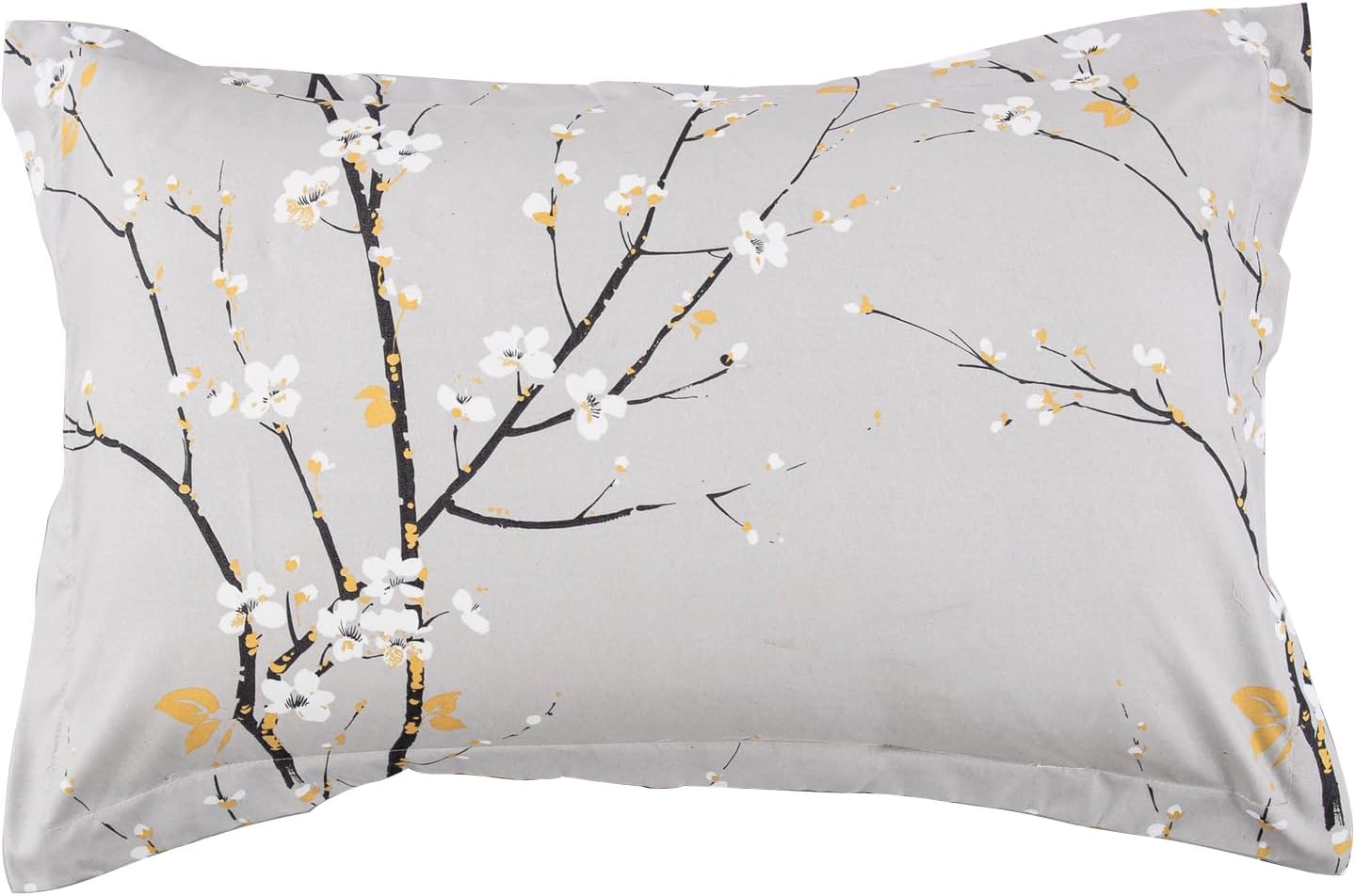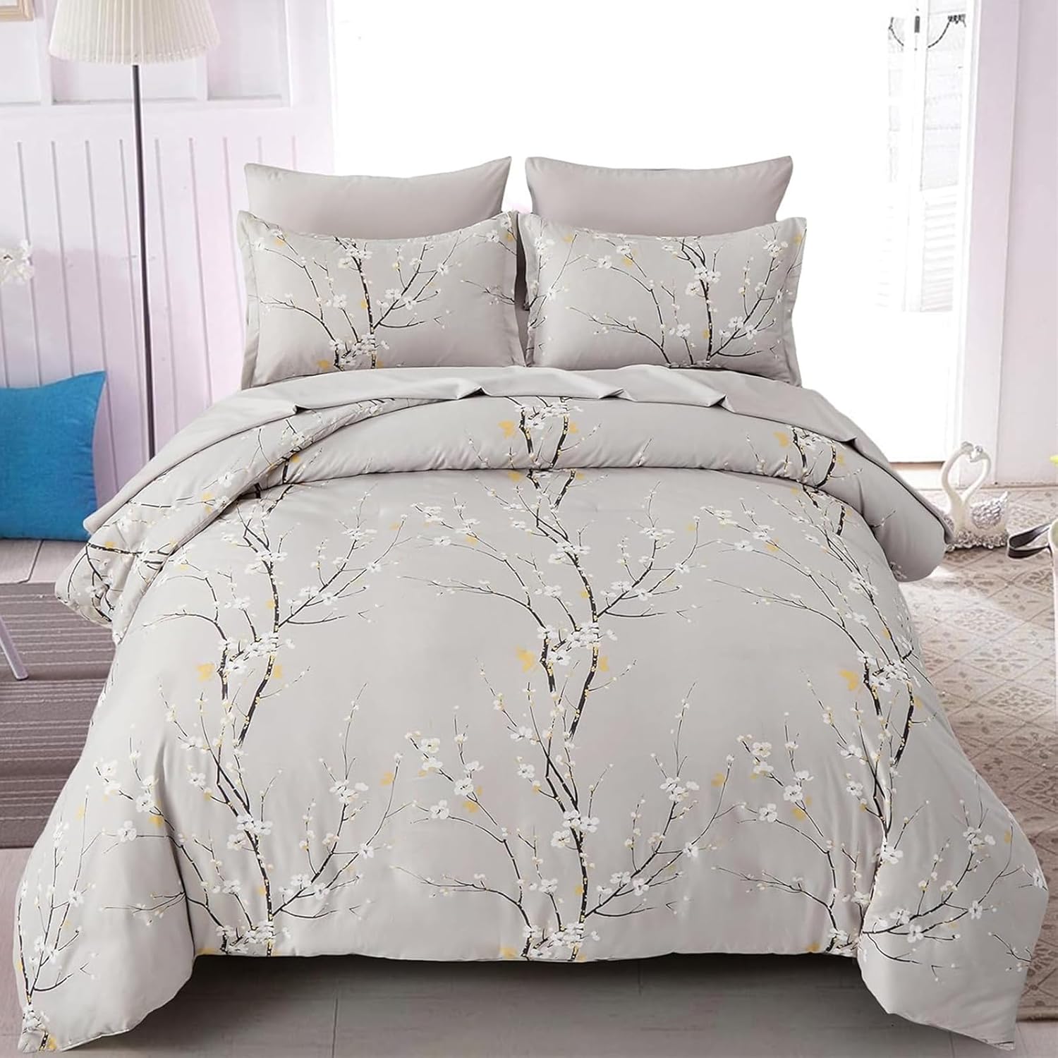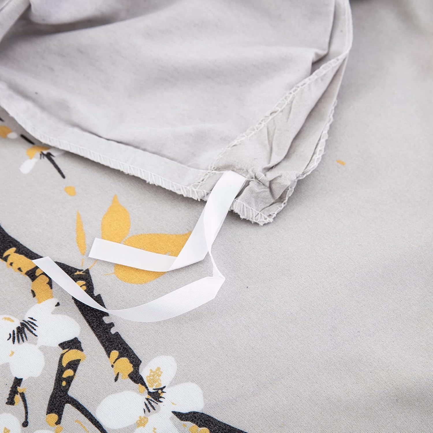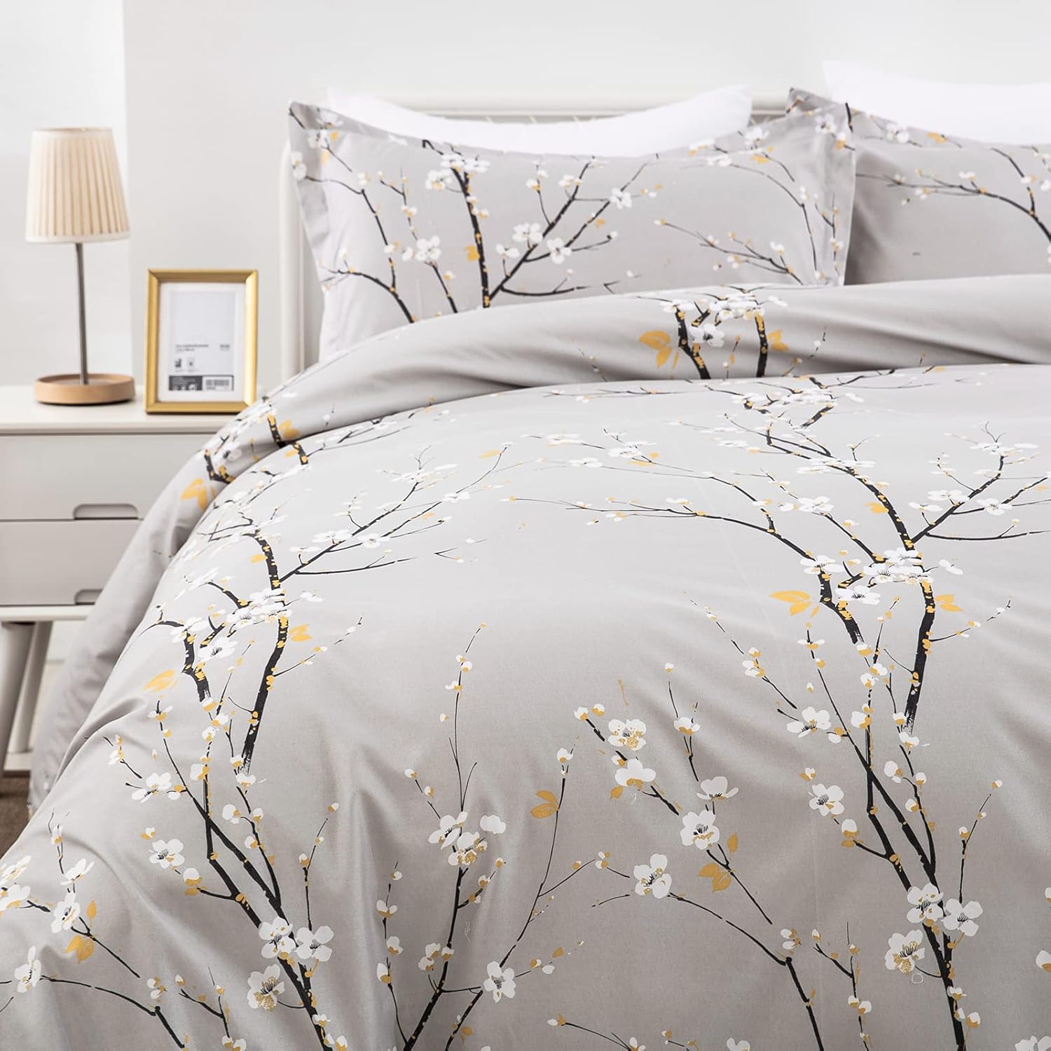 Double Size Grey Plum Flower Printed Duvet Cover Set bedding Set 3 pcs Soft Microfiber Botanical Branch Duvet Cover with 2 Pillowcases and Zipper Closure 200 x 200cm