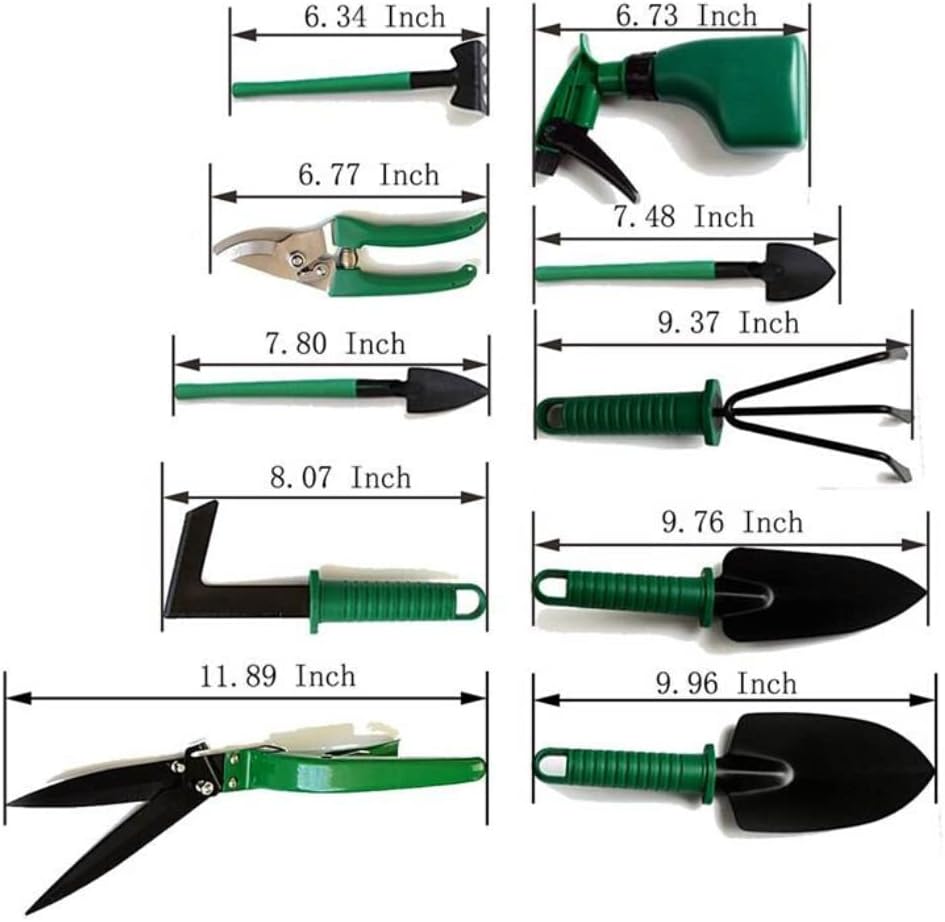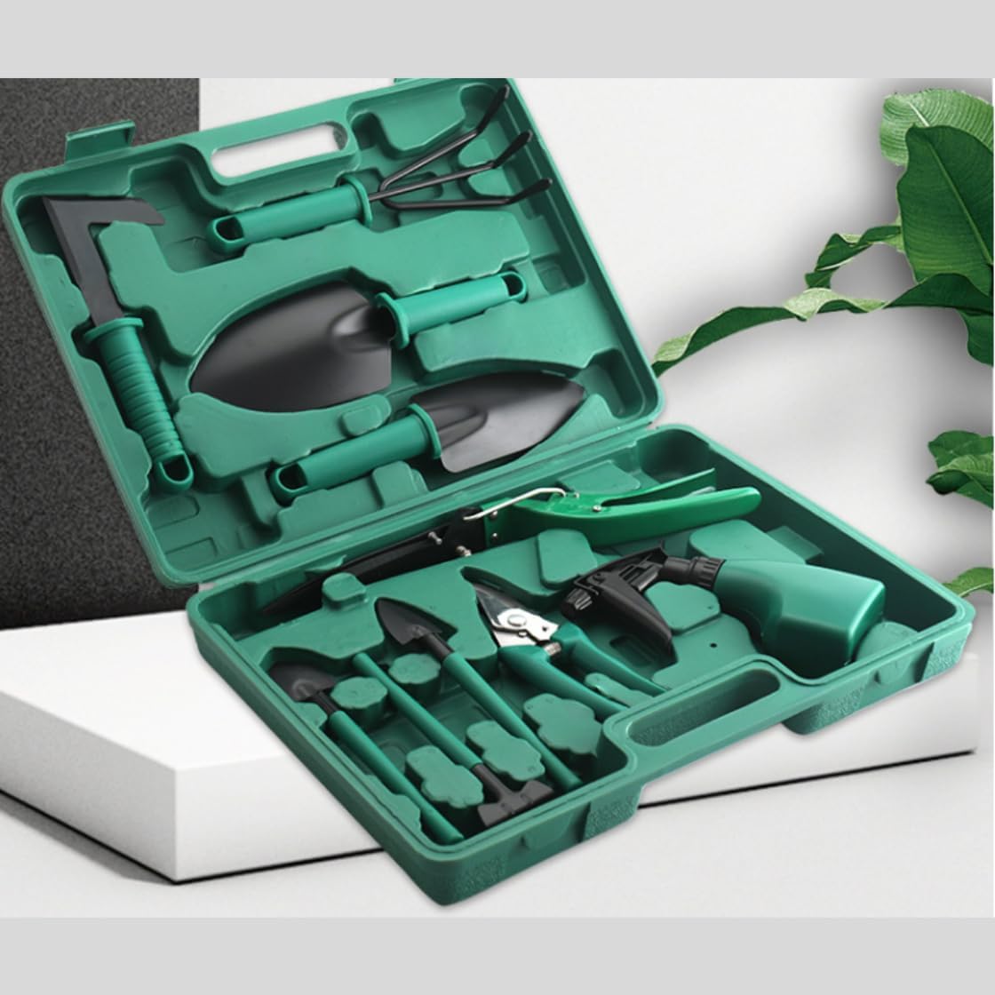 Garden Tools Kit (10pcs) with Case TOOLS INCLUDED Pruning shears Sprayer Pickaxe 2x Shovels Rake Spade Trowel Hoe Scraper MATERIAL Stainless steel head Ergonomic, easy-to-grip plastic handle Anti-rust iron paint WHY WE ARE BETTER 10-in-1 Gardening kit. Everything you need for your garden activities Durable and resistant tools set Reduce fatigue and make planting faster and more comfortable Lightweight case let you carry the tools with ease and store them when not in use Beautiful and fashionable design makes it a perfect gift for gardening lovers.