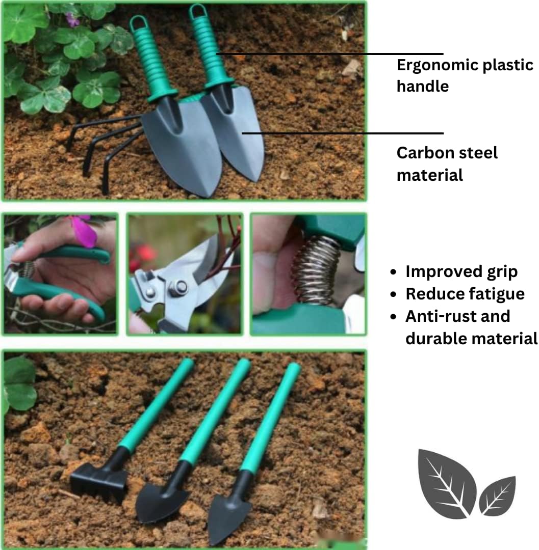 🌱DURABLE AND RESISTANT: Made with carbon steel material, this gardening set combines quality and durability. The high-quality material prevent rust and damages.