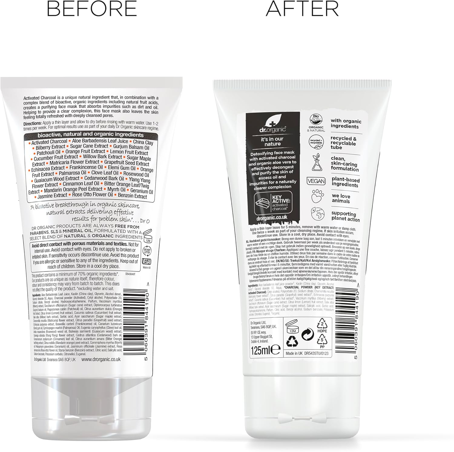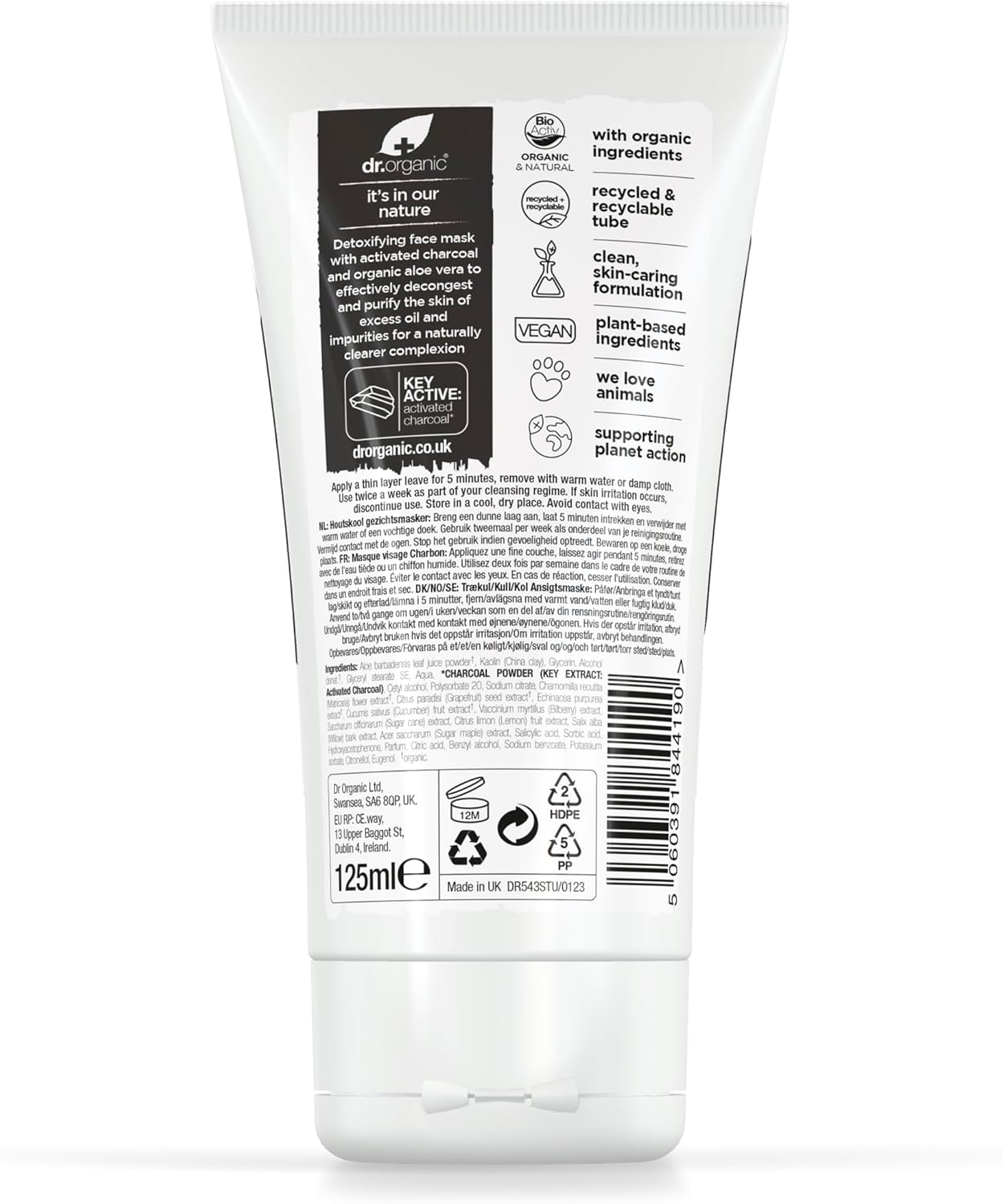 Dr Organic Charcoal Face Mask, Cleansing, For Acne & Clearing Skin, Oily, Problem Skin, Natural, Vegan, Cruelty-Free, Paraben & SLS-Free, Recycled & Recyclable, Organic, 125ml, Packaging may vary