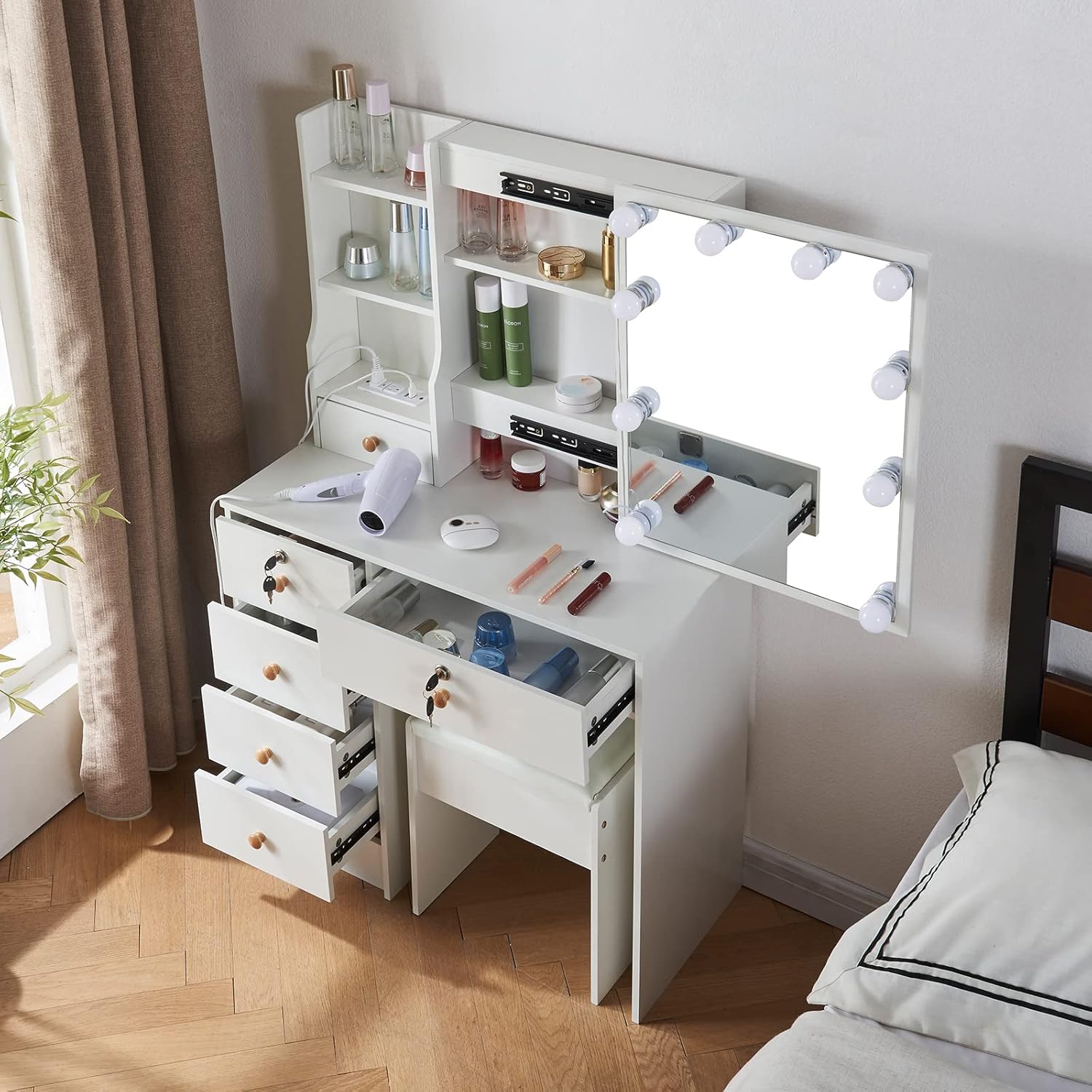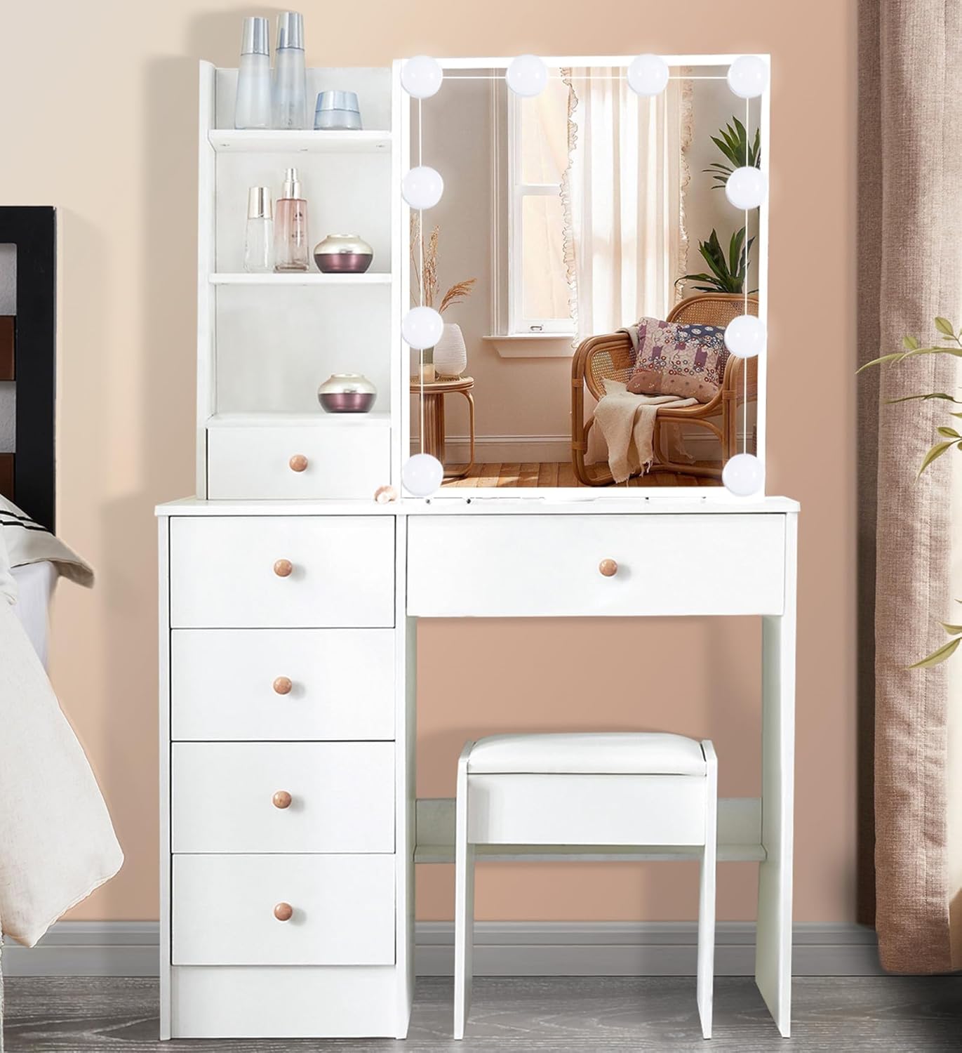 Dressing Table with LED Lights, White Vanity Makeup Table Set with Mirror and Stool, Bedroom Dresser Cosmetic Makeup Desk with Drawers and Shelves Storage Unit for Girls (A05)