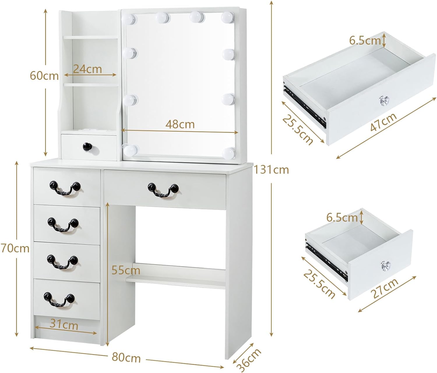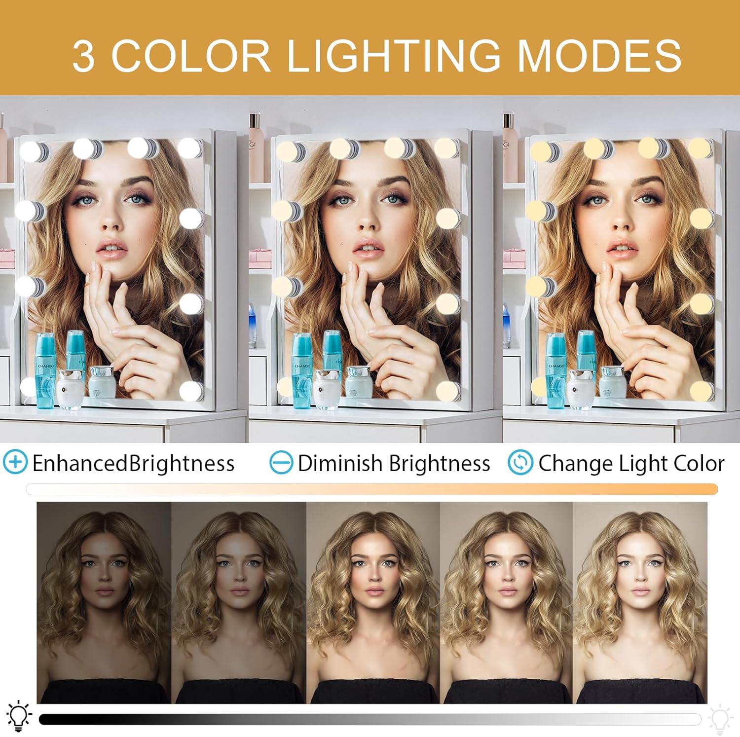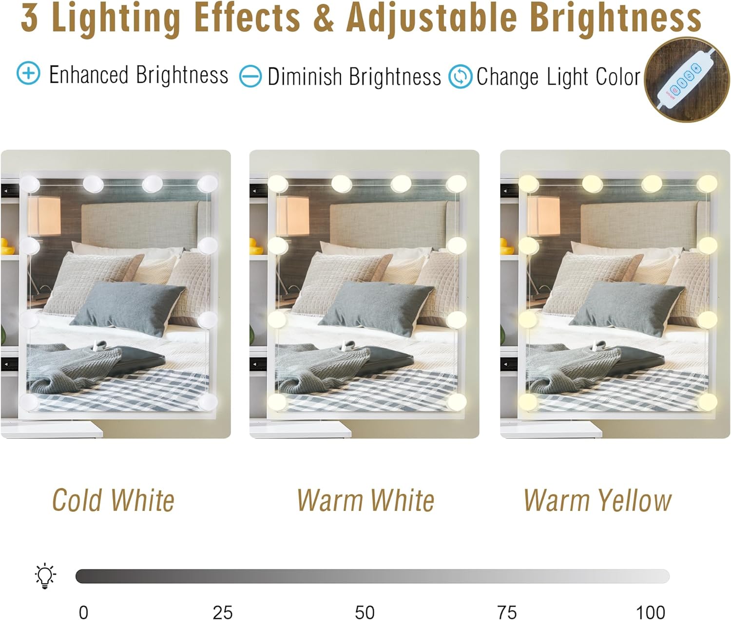 Dimmable 3 Lights: This makeup desk comes with lighted mirror equipped with 10 bulbs that brightness adjustable. The 3 lighting colors: cool white, warm white and warm yellow can meet your more needs.