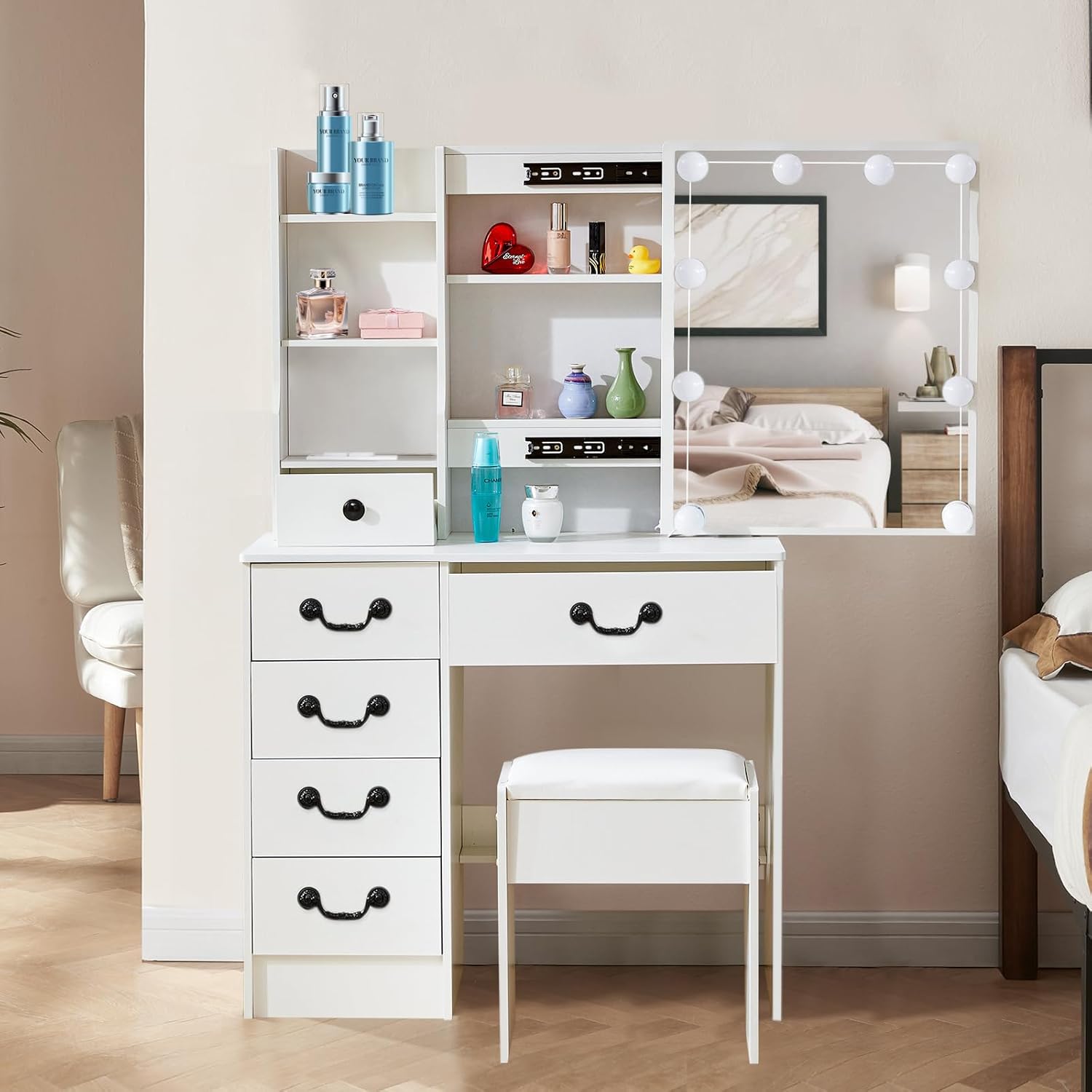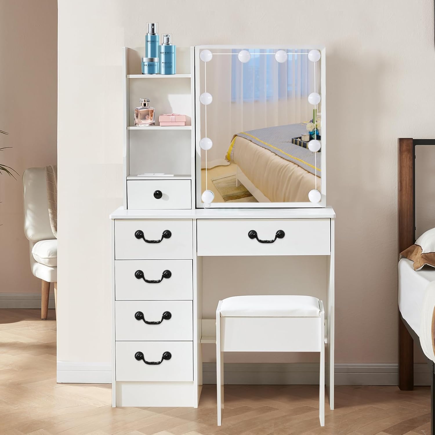 Dressing Table with Mirror and Charging Station, 3 Color Modes Vanity Set adjustable with 6 Drawers and Storage Shelves, Girls Dressing Table with Cushioned Stool for Bedroom