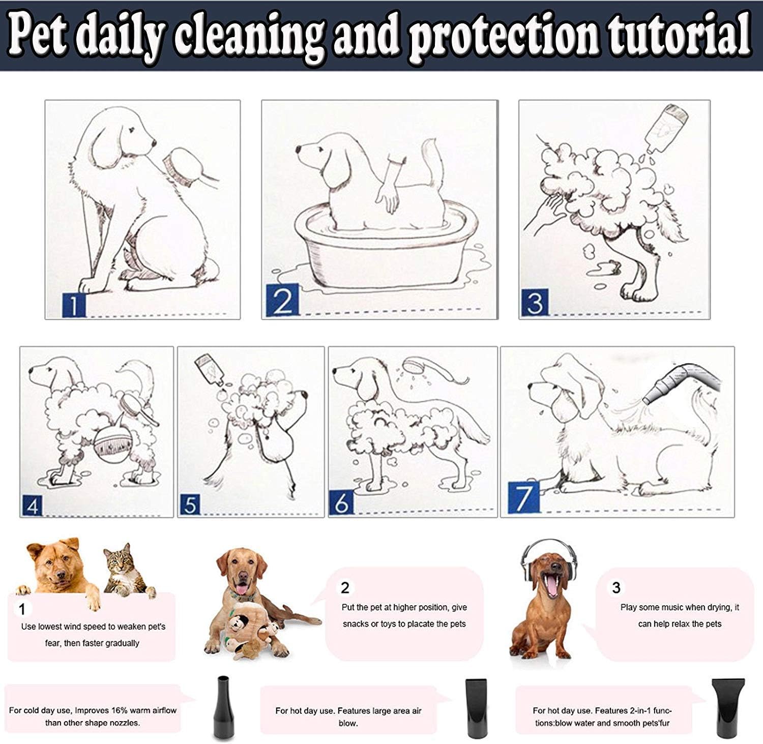 Save Time: A high power pet hair dryer for quick and effective drying, especially for dogs. 3 times stronger than normal hairdryer and easily remove the water from the fur in half of the time.