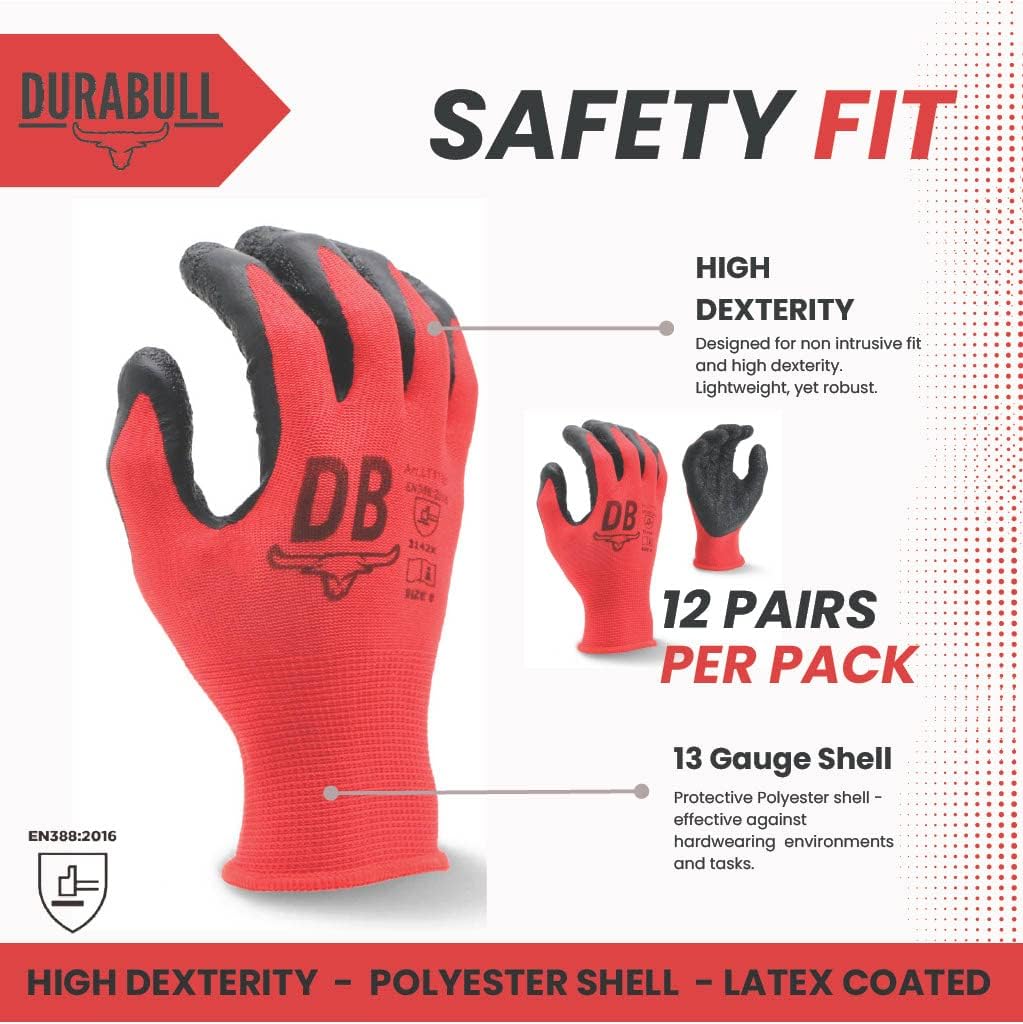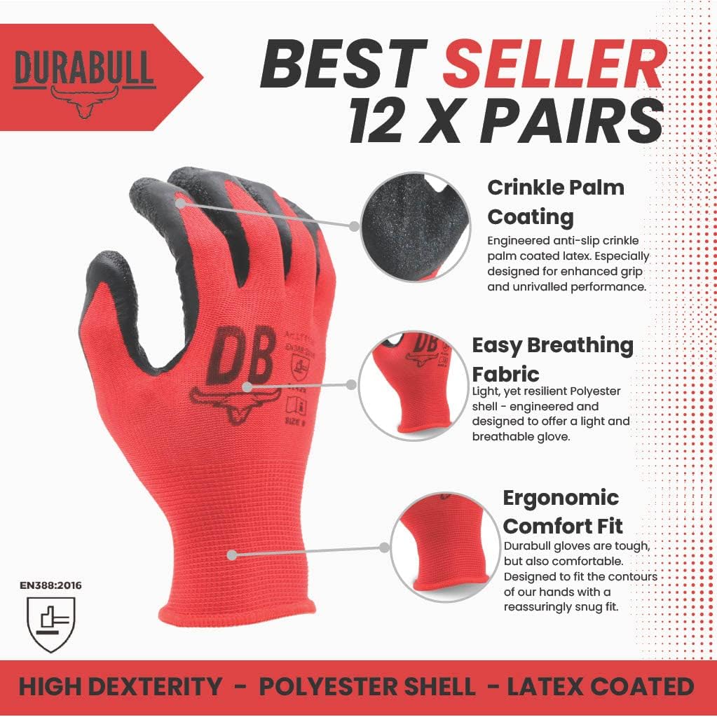 Durabull Latex Coated Work Gloves – Heavy Duty Protective Gloves For Builders, Garden & Working. Secure Fit With Anti Slip Grip. (Red, 8 (M))