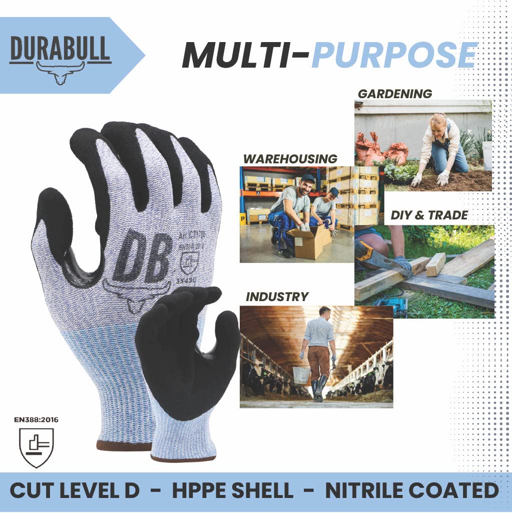 Durabull Multi-purpose Gloves. Protective Working Gloves For General Purpose, Nitrile Coated With Firm, Anti Slip Grip. Heavy Duty, Cut Resistant Safety Workwear Gloves. (2, 7 (Small))