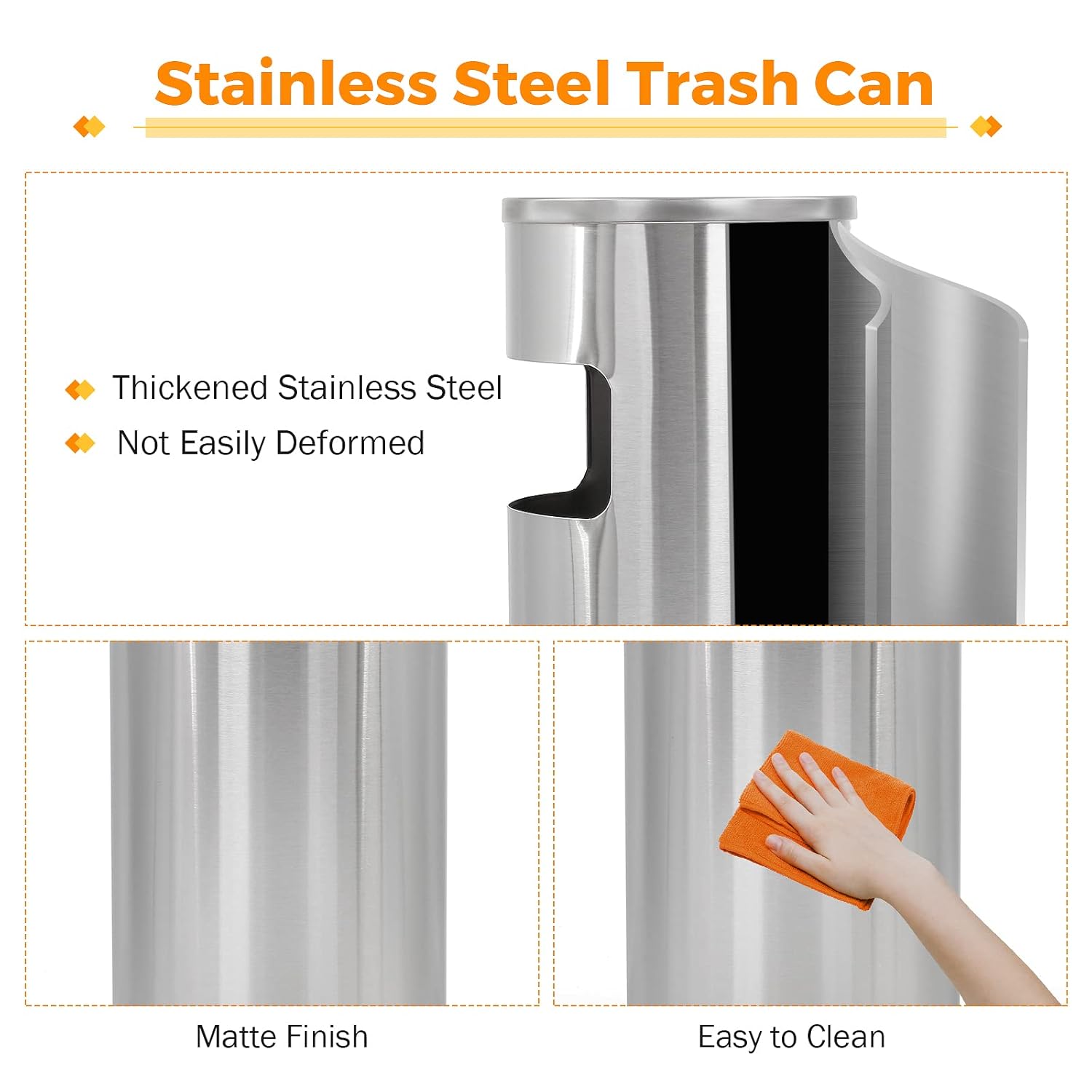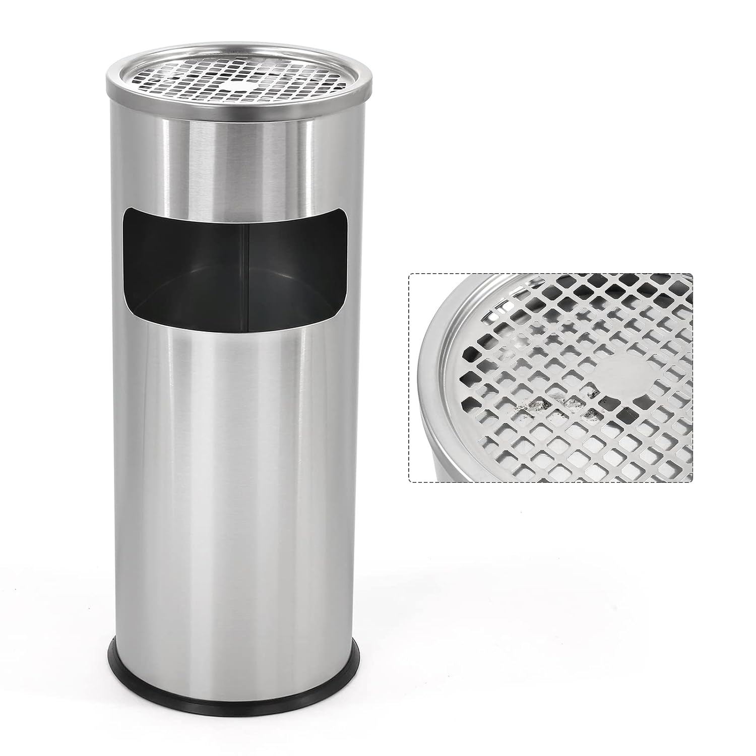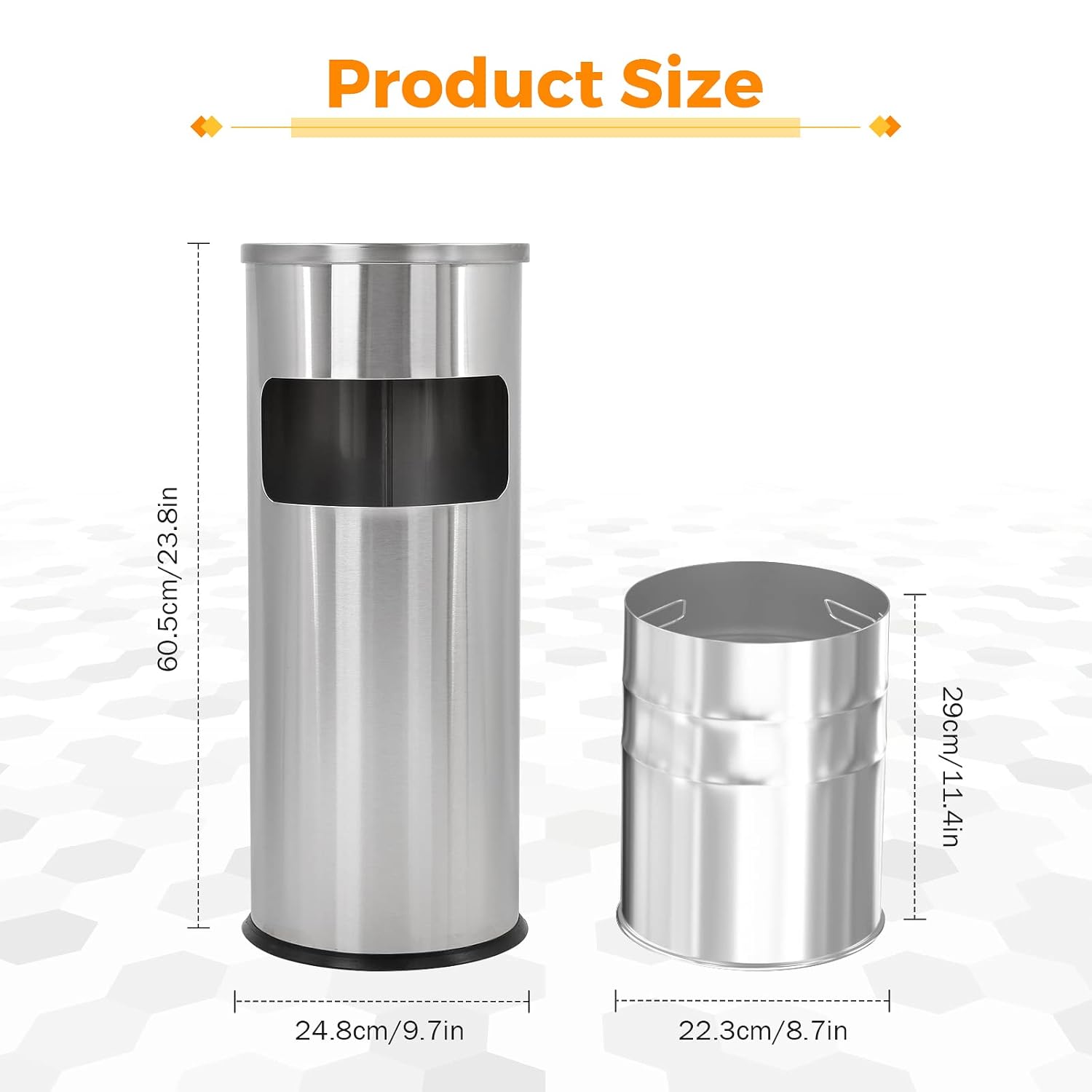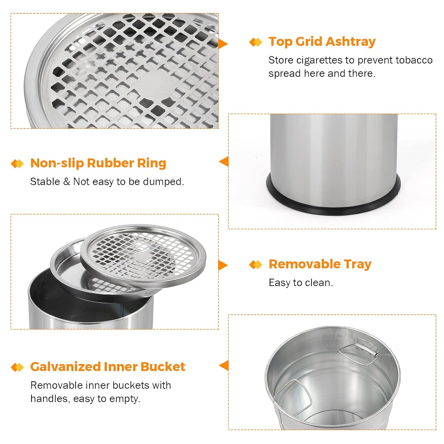 Friendly Design – This is a round garbage can with a stainless steel ashtray on top for cigarette disposal.Bottom with non-slip rubber ring, not easy to dumped.Round barrel body with rounded edges to prevent hand scratches.