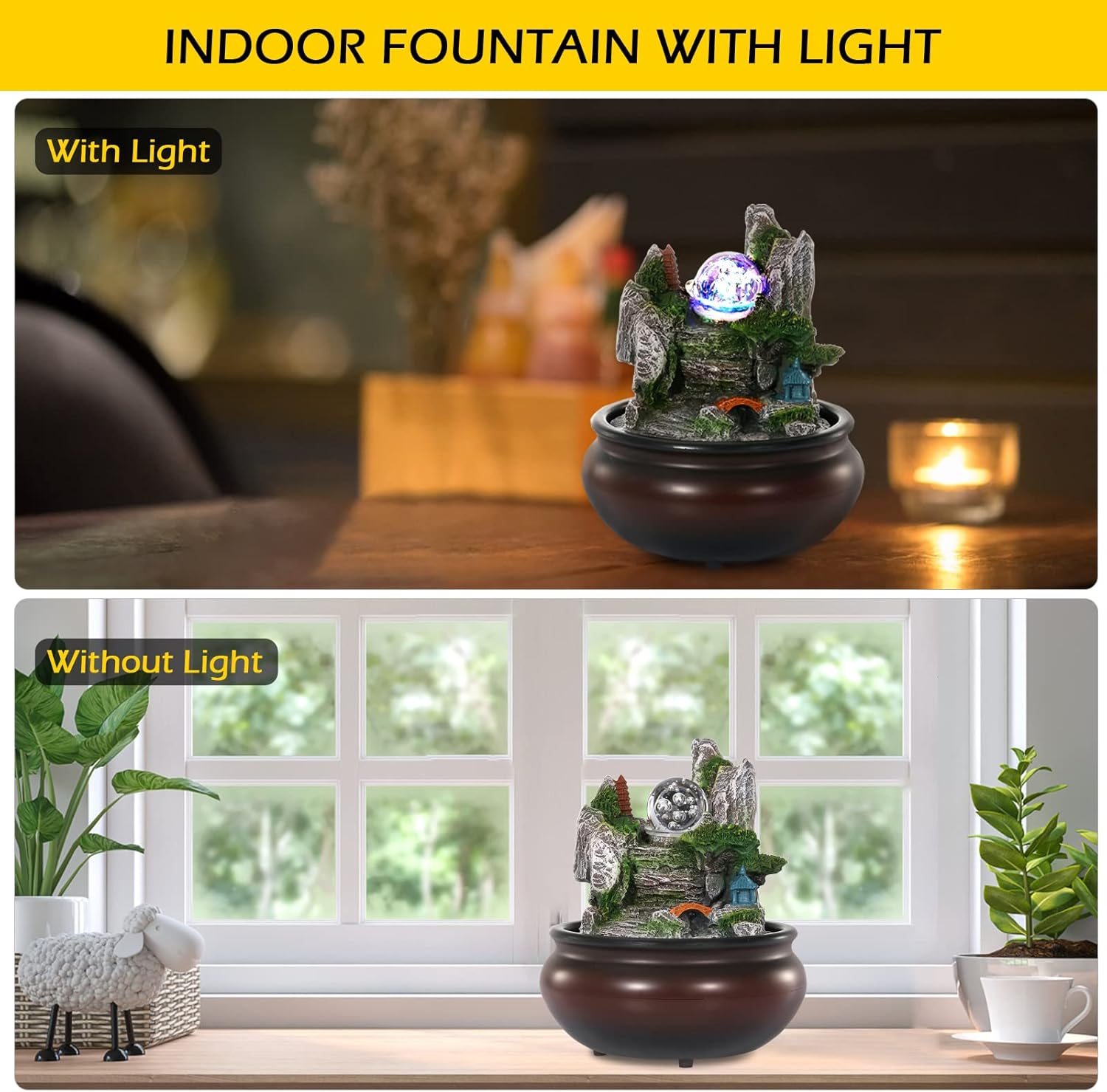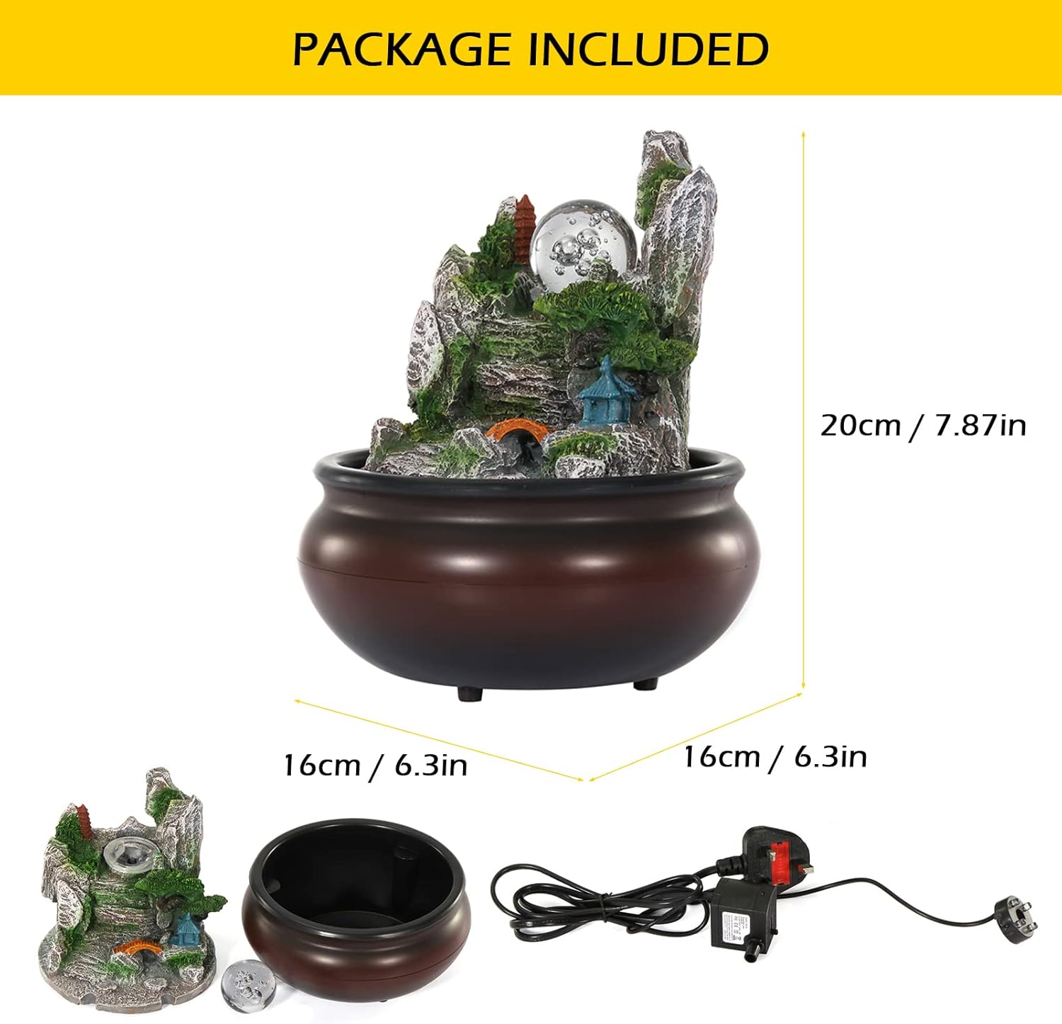 【PACKAGE CONTENT AND USAGE】-Dyna-Living fountain comes with Water Circulation Pump, 1.5m Lead with 3 pin plug . Output: 220 – 240 V. The indoor fountain is easy to use,connect the given tube with the electric pump, add water and plug it in!(The specific usage can be seen in the picture description).