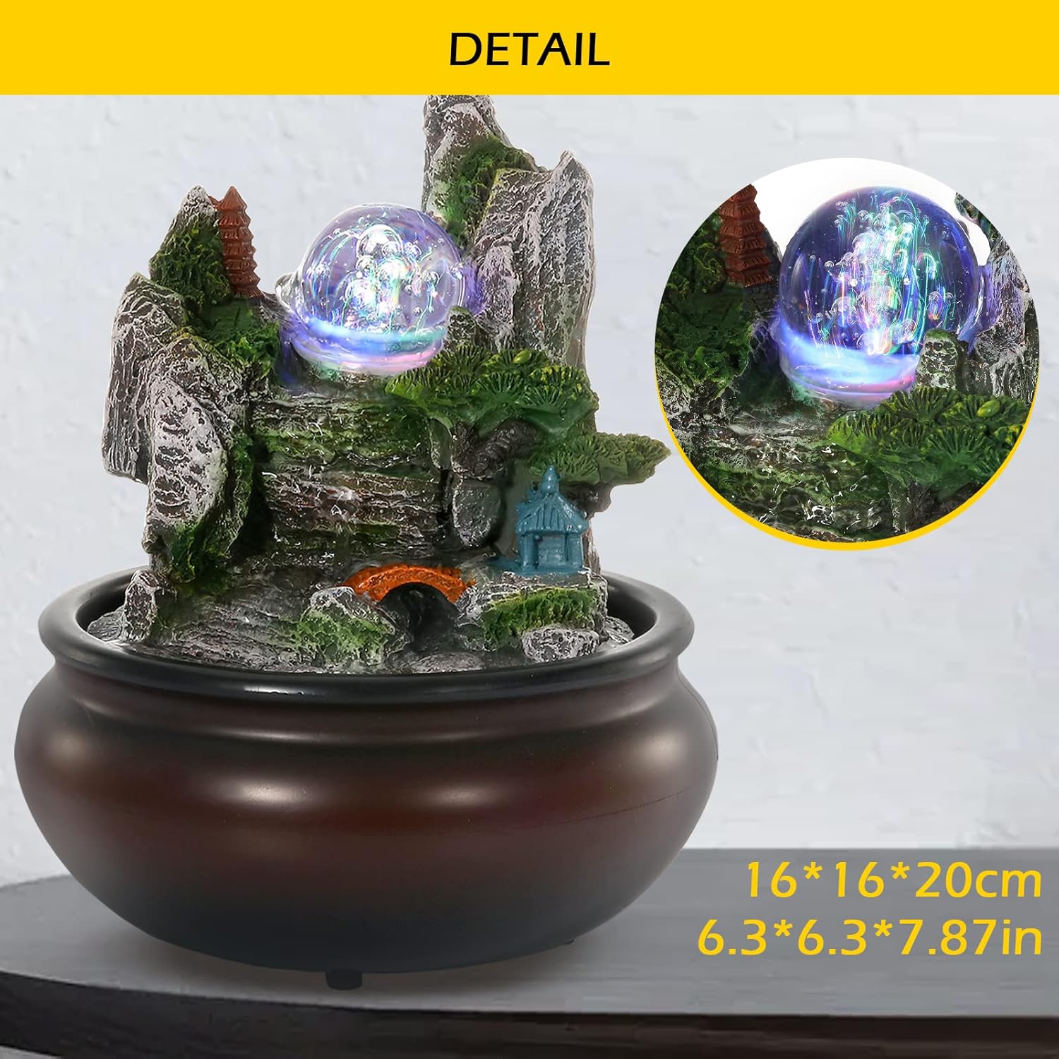Dyna-Living Tabletop Water Fountain,Environmental Resin Meditation Fountain,Desktop Fountain,Indoor Waterfall Feature with Crystal Ball and Light for Home Office Decor Relaxation 6.3”X6.3”X7.9”
