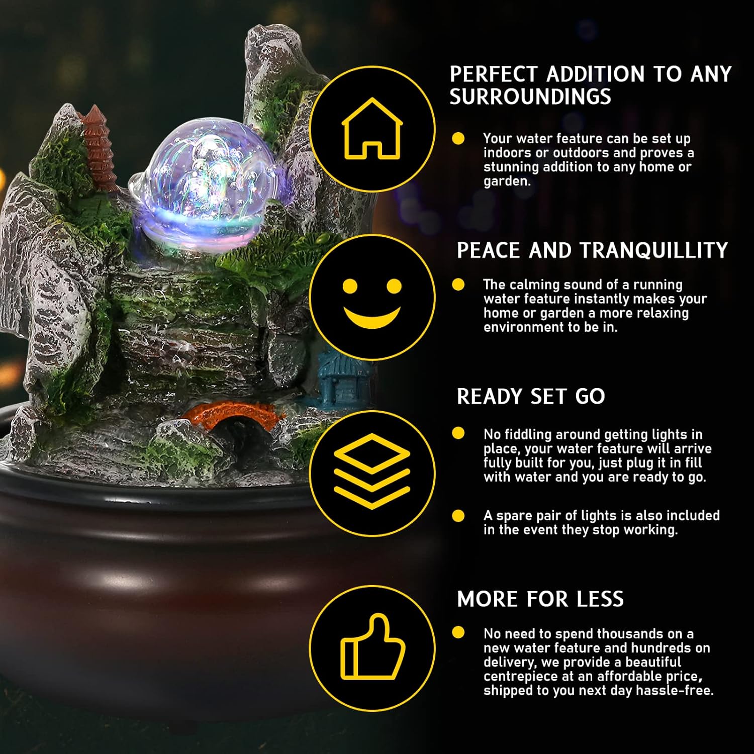 【SOOTHING SOUNDS】 – Water fountain is a wonderful way to create a peaceful and welcoming atmosphere inside your home. This relaxing tabletop fountain lets you listen to the sounds of a waterfall crashing down onto the tiers below as the sound and sight of trickling water is naturally soothing and water fountains to help induce a feeling of calm and relaxation.