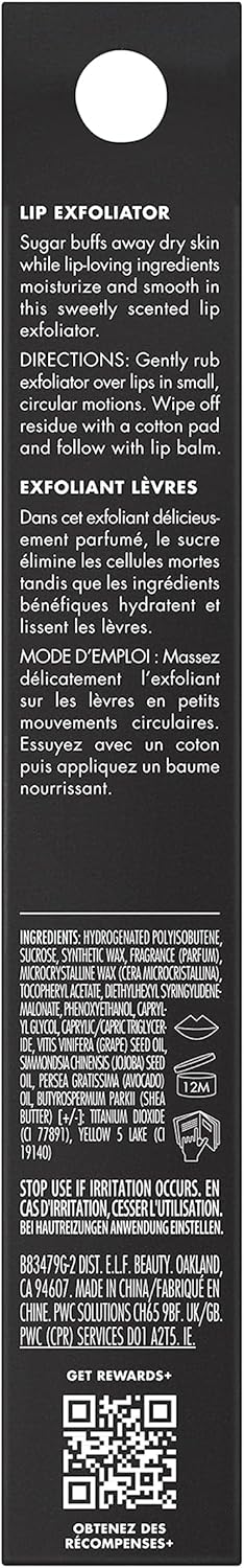 What is it: A moisturising lip scrub that gently removes dry, dead skin, revealing lips that look and feel smoother. Why we love: Smooths and conditions lips Sugar texture gently buffs lips Sweet, sugary scent Key Ingredients: Jojoba Oil – Locks in moisture Shea Butter – Nourishes lips for a smooth finish Avocado Oil – Moisturizes and protects Hey, sugar lips Prep your pout with this nourishing exfoliating lip sugar scrub—it gently removes dry, dead skin from your lips and moisturizes for a smooth and kissable feel. With exfoliated lips, your lipstick will glide on with ease, look smoother, and stay on longer. Ready for the sweetest part? The indulgent sugary scent that you won’t want to stop using. All e.l.f. products are free from phthalates, parabens, nonylphenol ethoxylates, triclosan, triclocarban, and hydroquinone. All skincare is also free from sulfates.