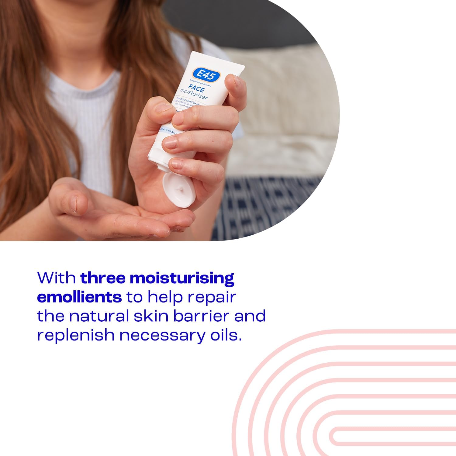 INSTANT MOISTURISATION – E45 Face Moisturiser is a fast-absorbing and non-greasy facial moisturiser that gets to work instantly for effective and long-lasting moisturisation. The lightweight formulation is absorbed quickly and does not leave any residue on the skin. Our facial moisturiser improves the skin’s natural moisture barrier for all-day hydration and does not leave your face feeling oily – it is absorbed quickly and is suitable for everyday use.