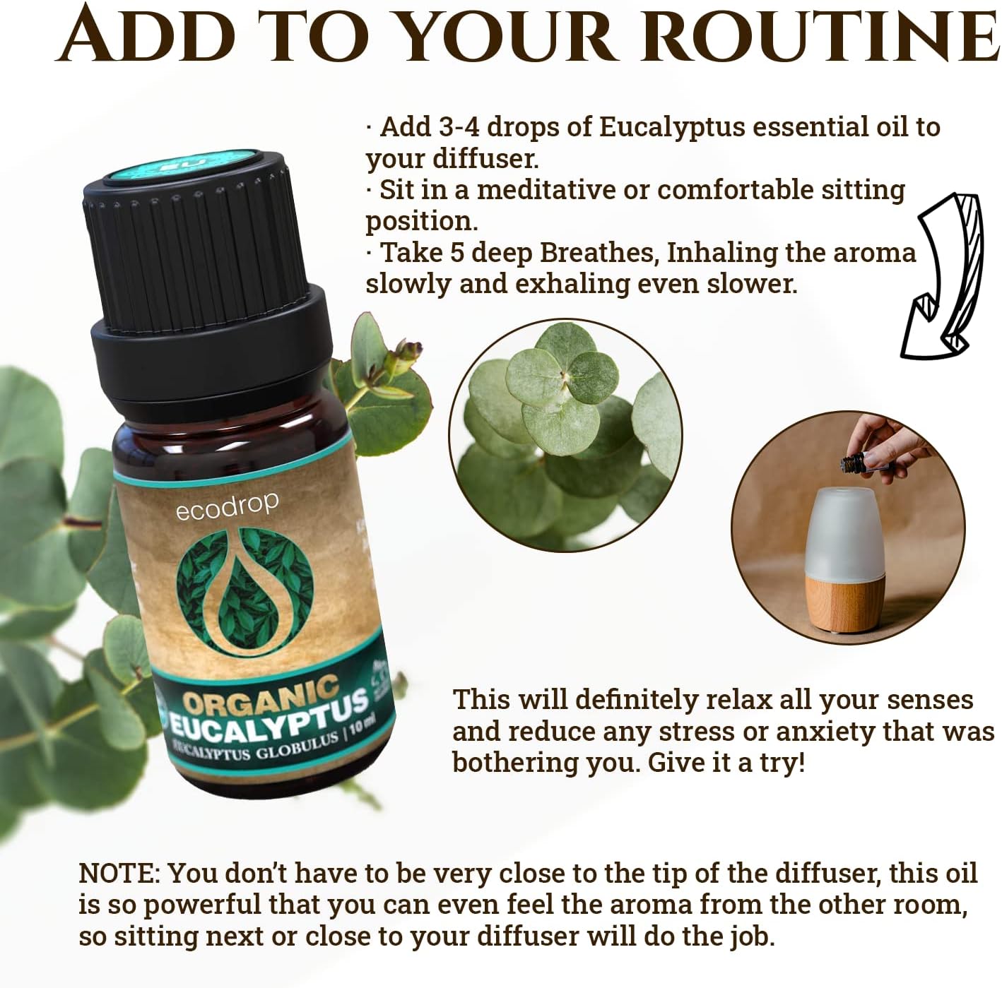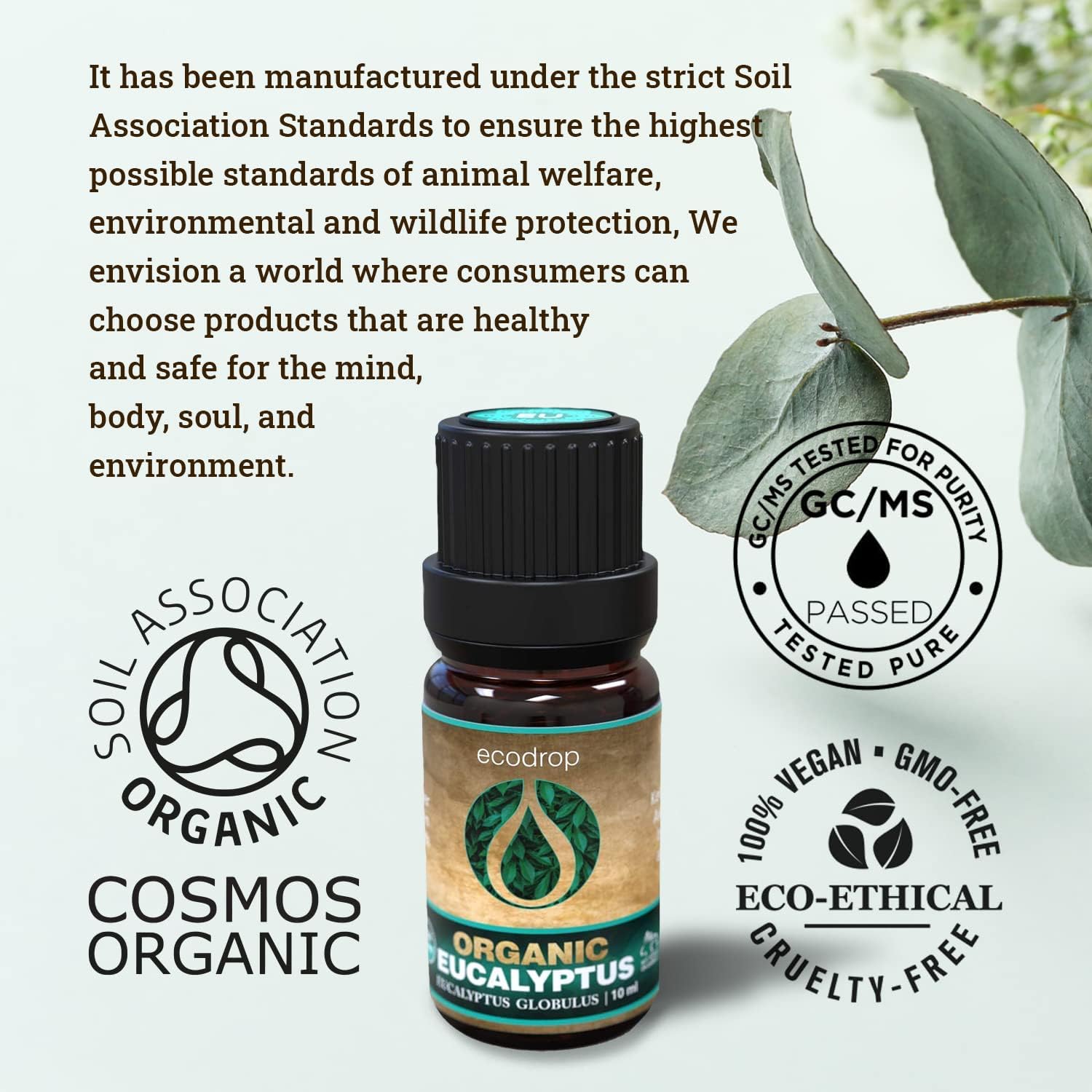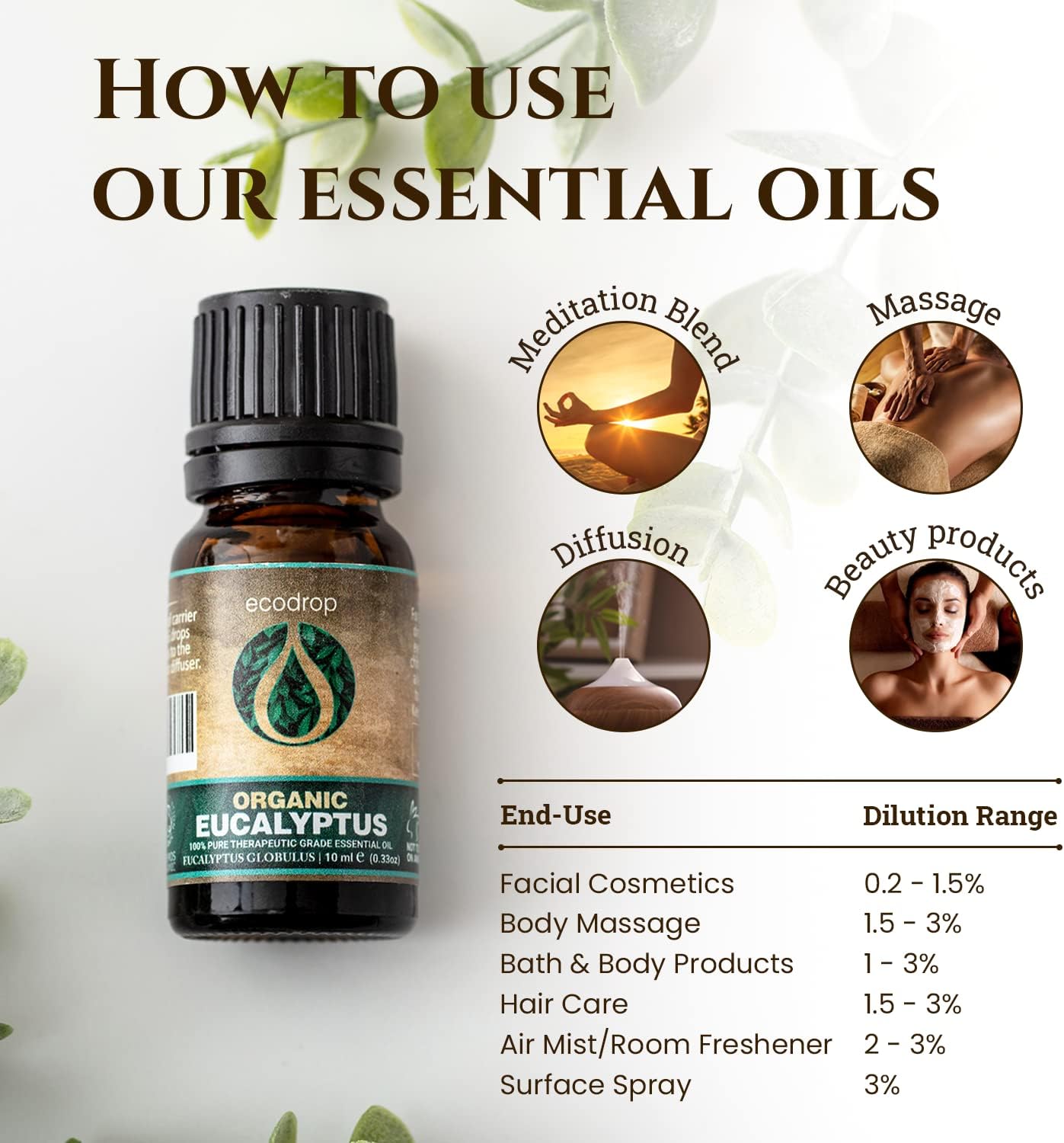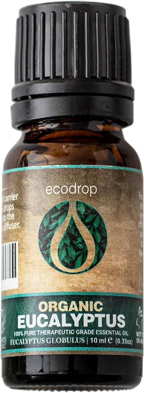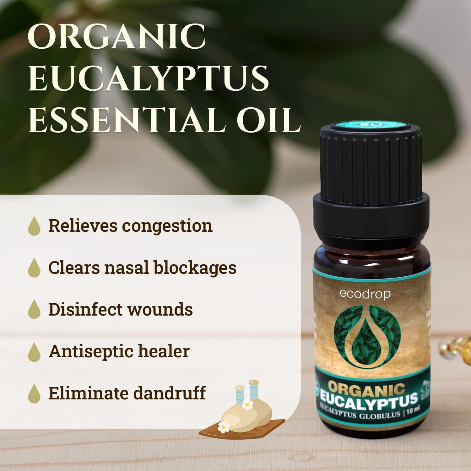 Ecodrop Pure Eucalyptus Essential Oil – 10ml Bottle | 100% Natural Therapeutic Grade Eucalyptus Globulus Oil | Aromatherapy Massage, Diffuser & Bath Oil for Mood, Immunity & Pain Relief | Organic