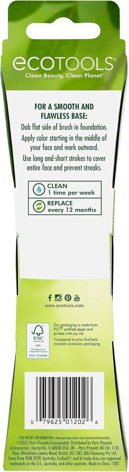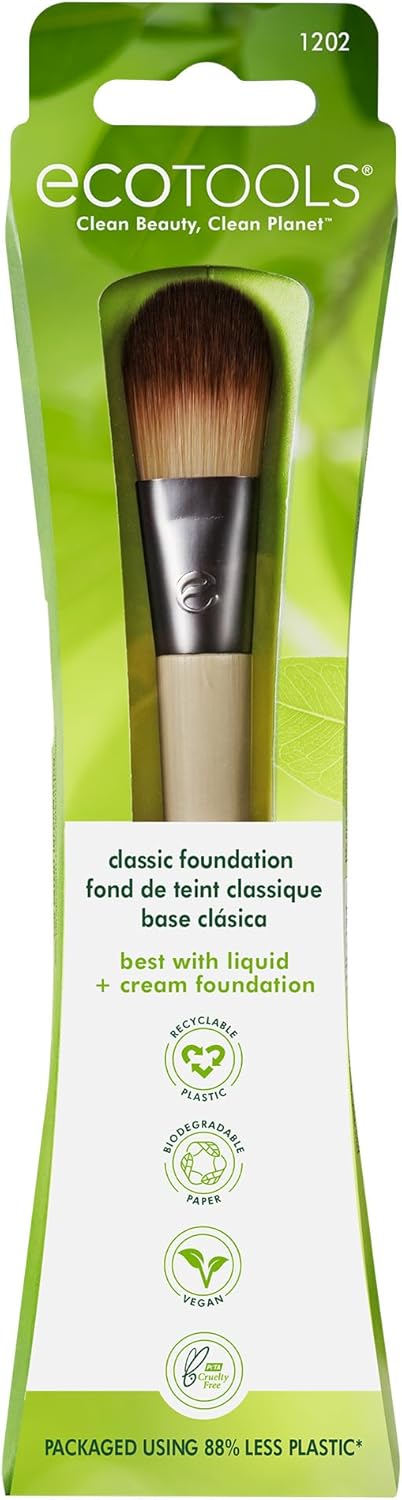 EcoTools Classic Foundation Face Brush, For Liquid, & Cream Foundation, Flat Foundation Brush For Natural Makeup, Buildable Coverage, Synthetic Bristles, Vegan & Cruelty- Free