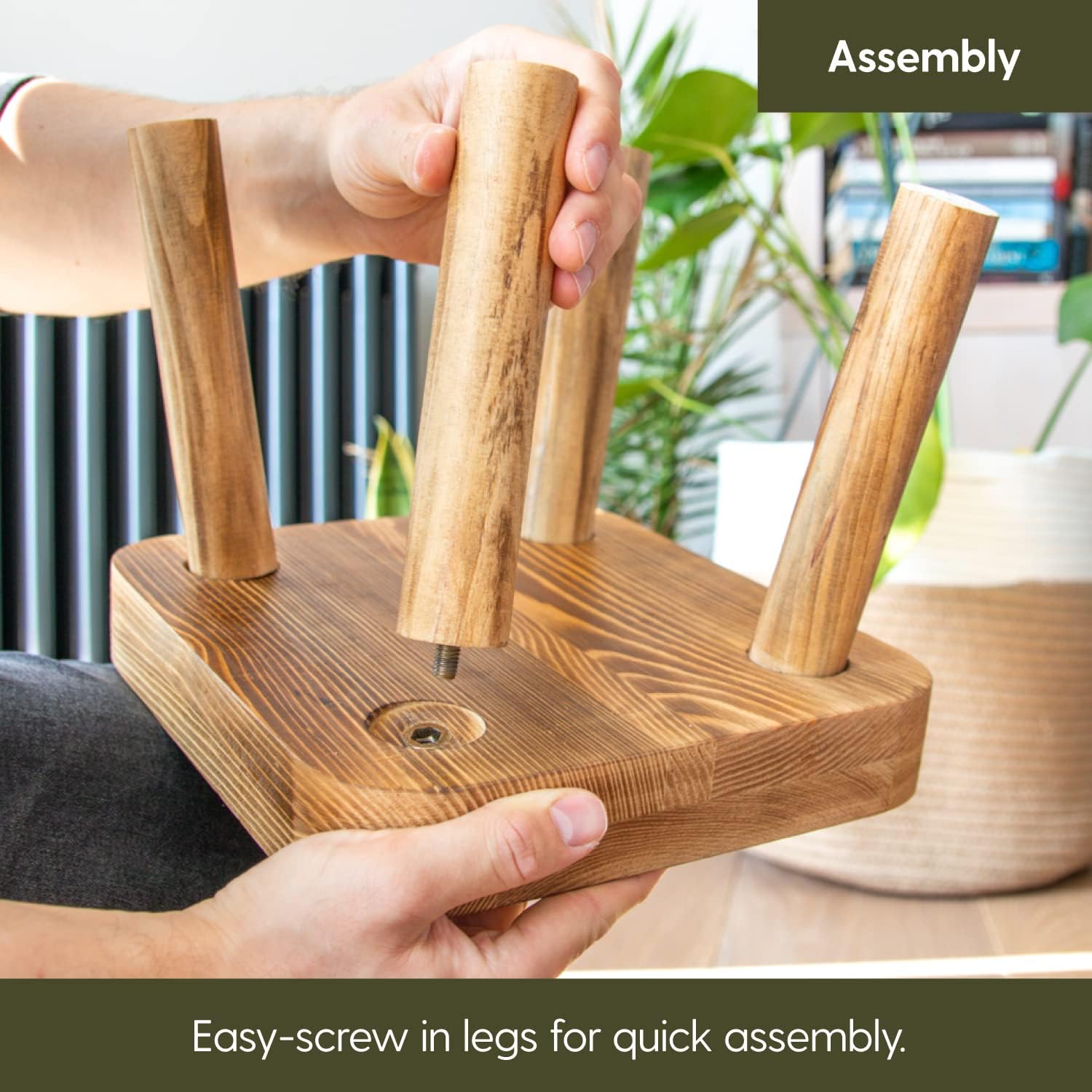 Assembling your Eden Creations wooden stand is as easy as it gets. Just screw the 4 easy-assemble legs into the wooden stand and get going.