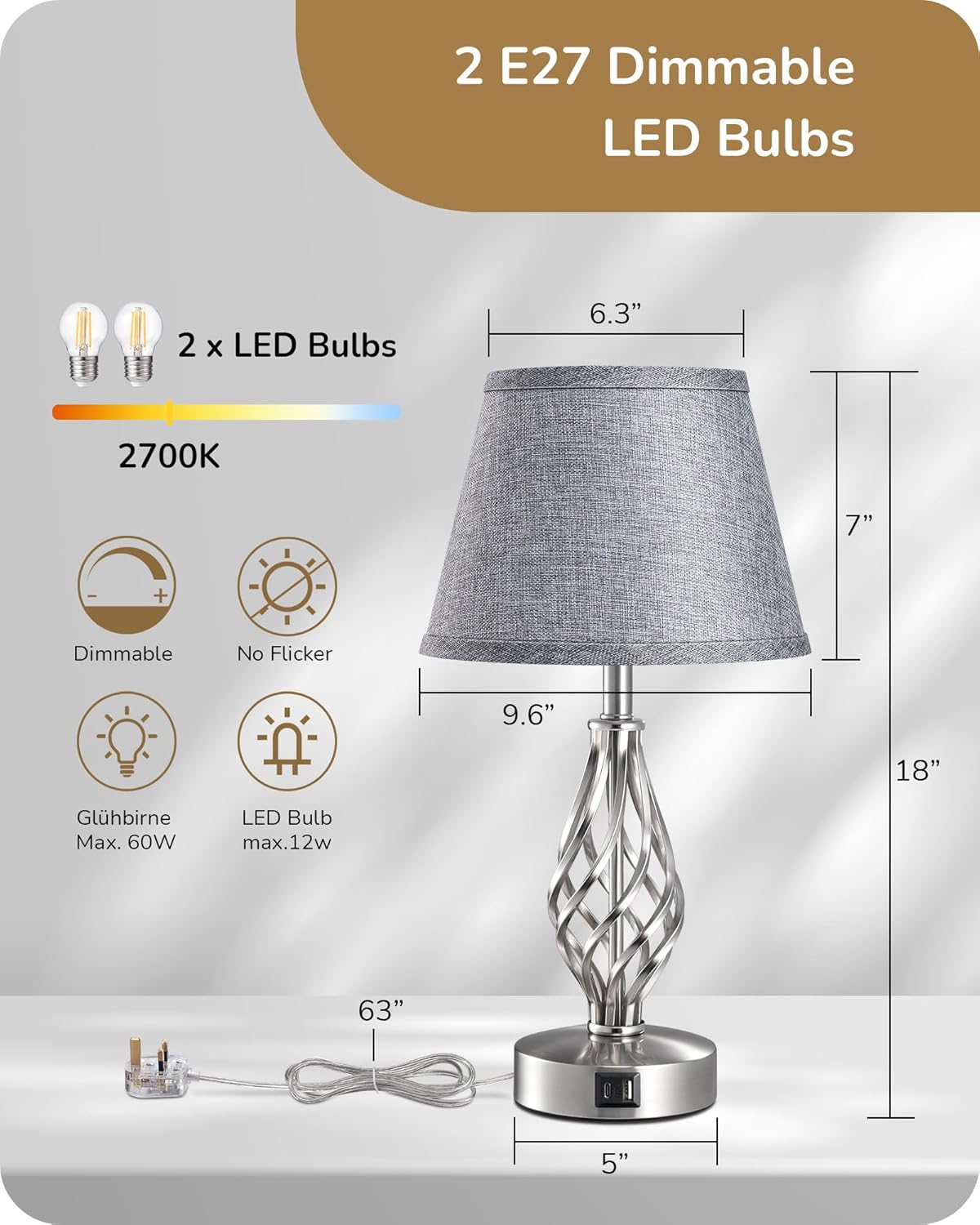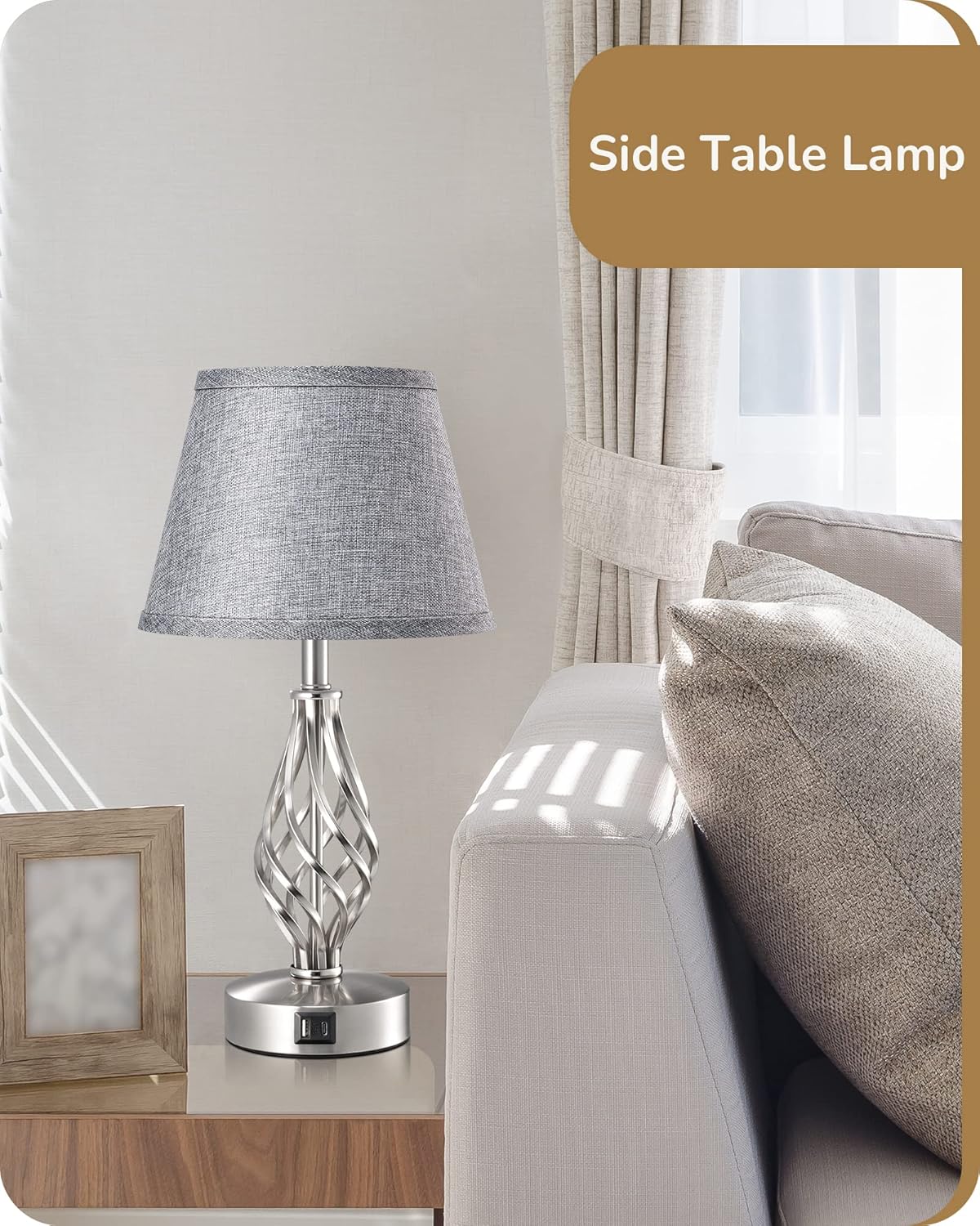 EDISHINE Bedside Lamps Set of 2, 3 Way Dimmable Touch Lamp with USB Charging, Table Lamps for Living Room, Bedroom, Grey Linen Shade, Spiral Cage Base (LED Bulbs Included)