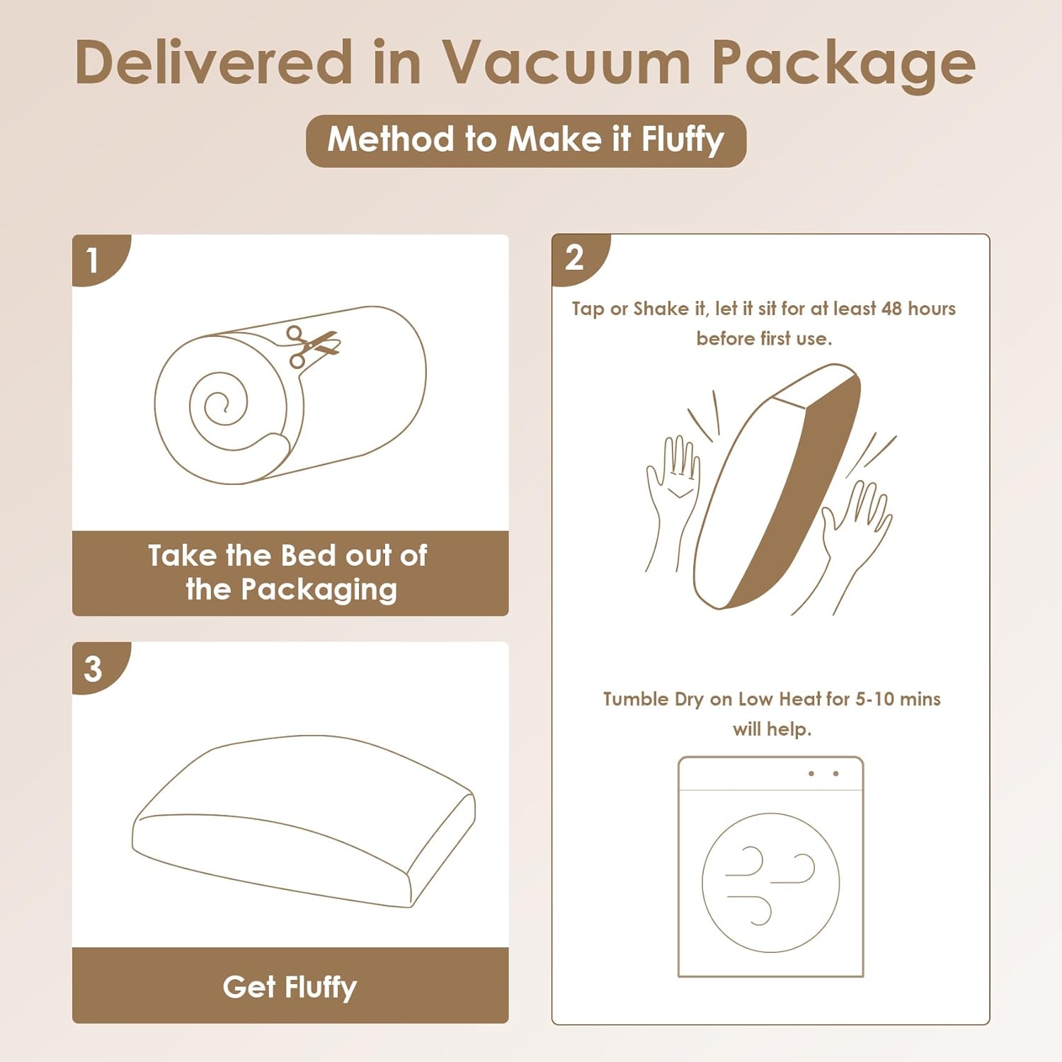 Note: The dog cushion is compressed for packaging. Please allow it to rest for 24-48 hours after opening the package to regain its shape. It is recommended to give it a shake or pat before use to help the filling recover evenly and achieve a plump and full state. In addition, low temperature drying for 5-10 minutes will help the shredded sponge to bounce back quickly.