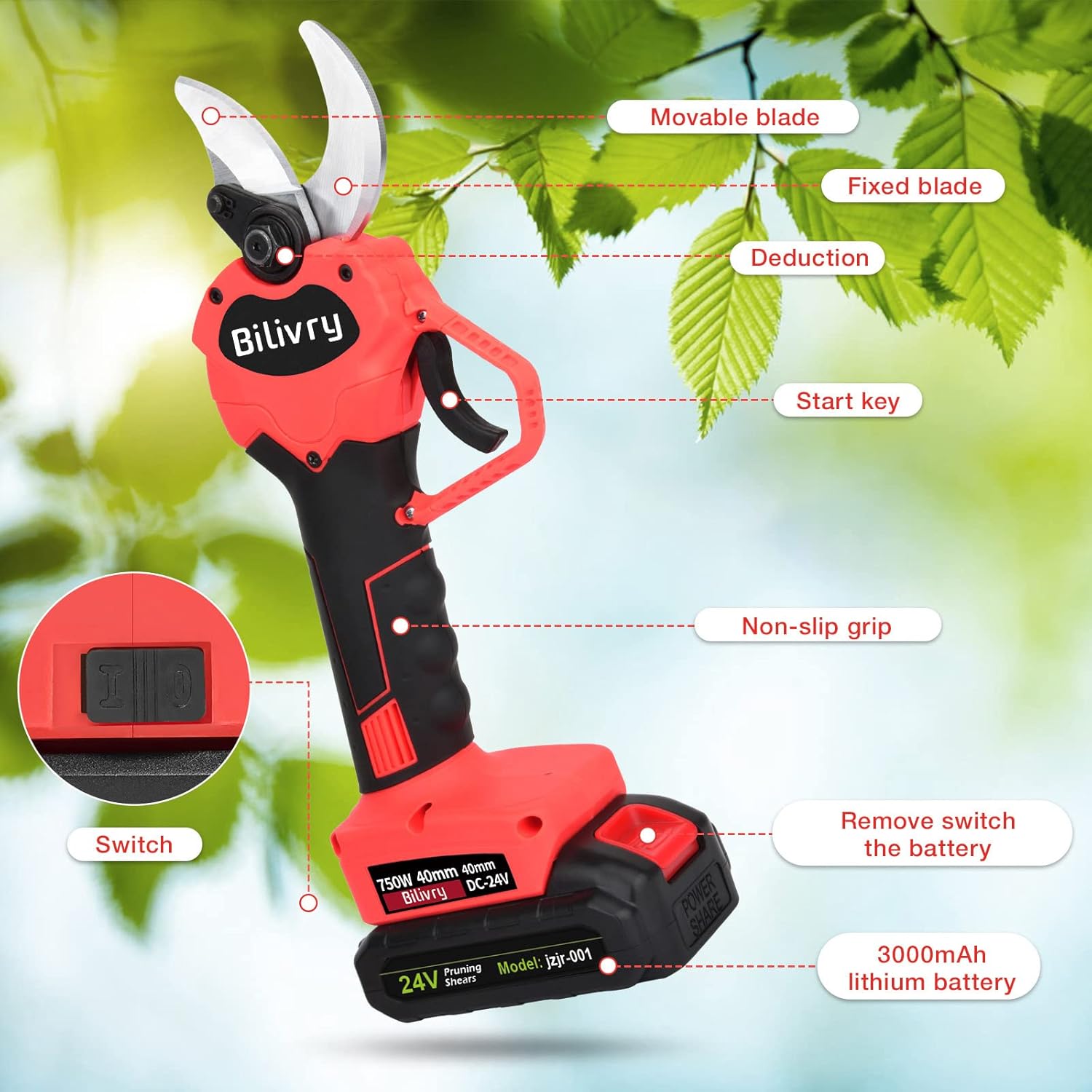 User-Centric Design and Enhanced Safety: The electric secateur excels in both user comfort and safety, featuring an ergonomic design that minimizes strain and fatigue during prolonged use, while also being equipped with safety blade lock, ensuring the prevention of accidental injuries during operation.