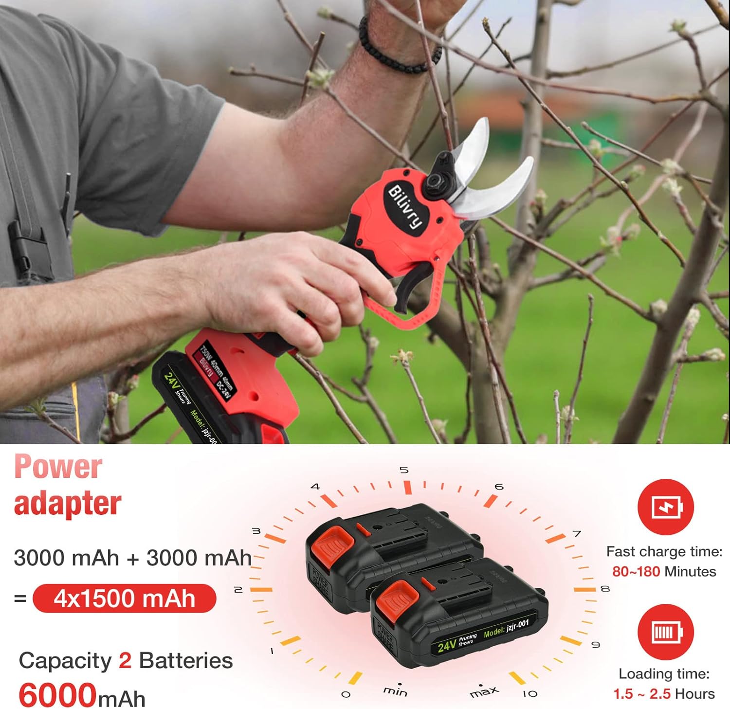 2 Pack Li-ion Battery: The Cordless Tree Branch Cutter is equipped with 2-pack rechargeable lithium batteries, long lasting battery ensure uninterrupted gardening sessions. With a charging time of 3-4 hours, a fully charged battery provides an impressive 8-10 hours of continuous pruning operation.