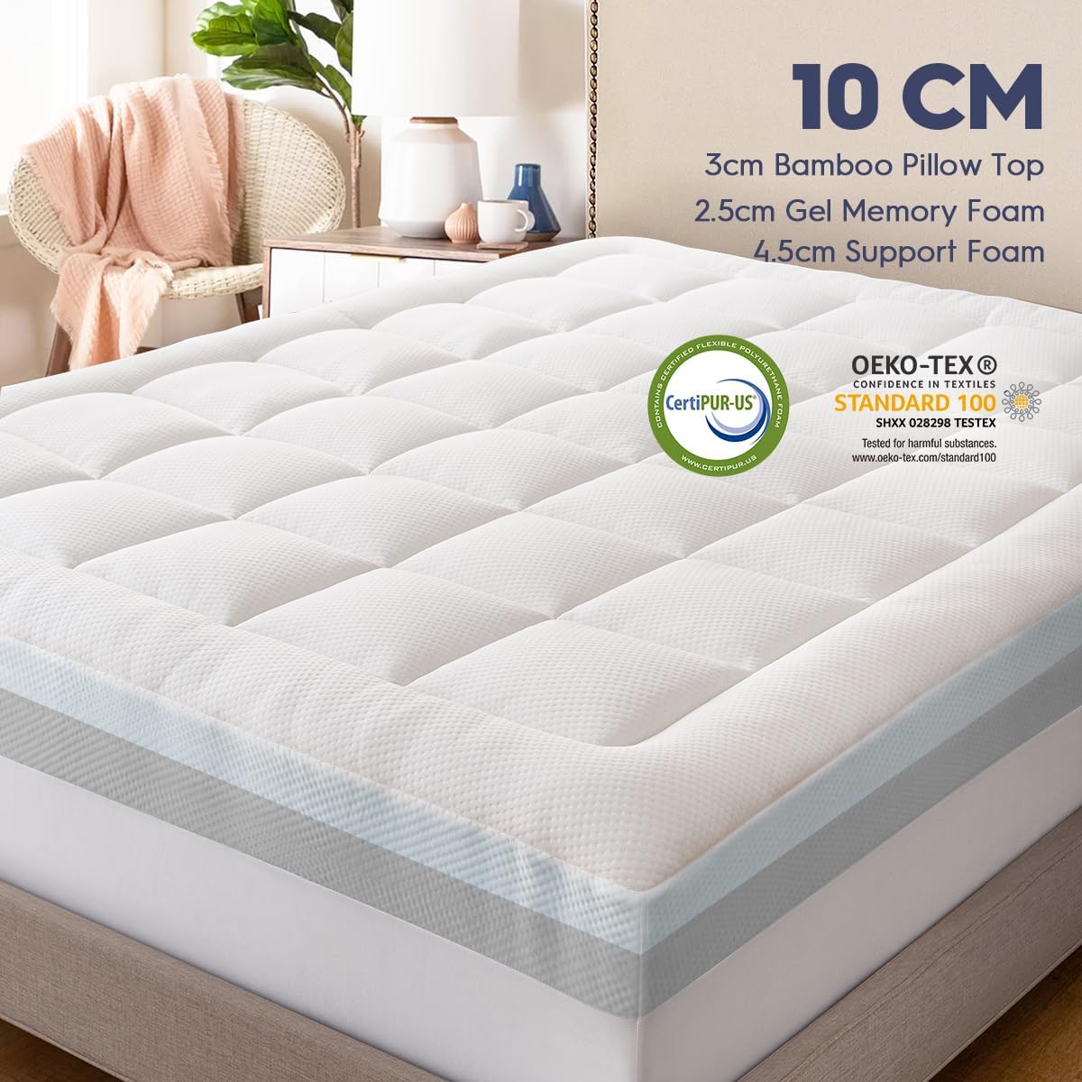 ELEMUSE Dual-layer Memory Foam Mattress Topper with Bamboo Pillow Top Cover for Back Pain Relief, with OEKO-TEX & CertiPUR-US (Double 135x190cm,10cm)