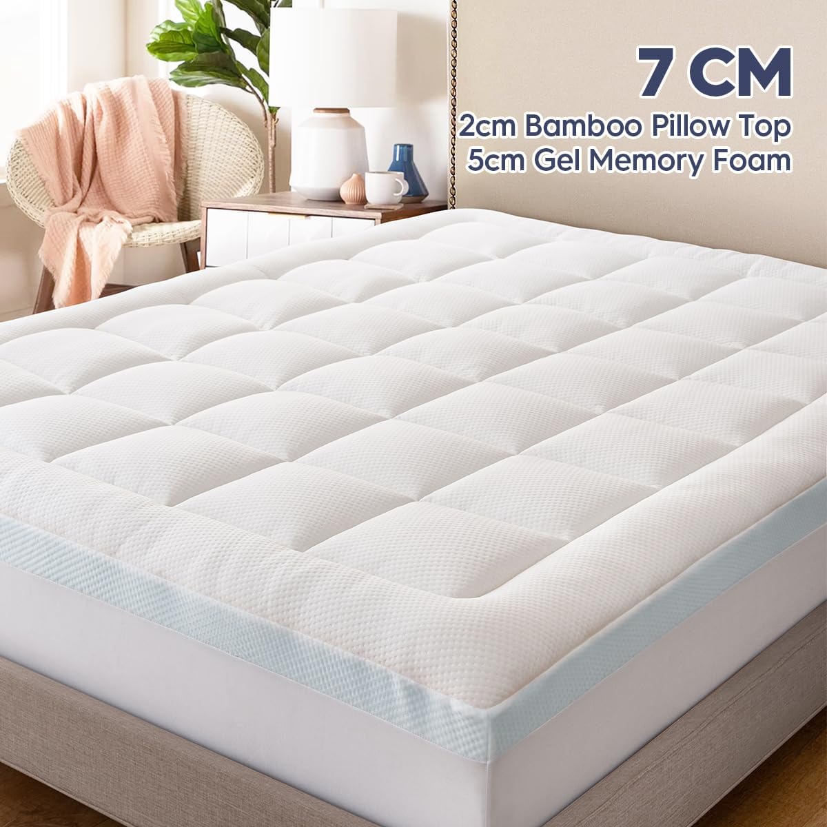 Upgraded Design: Features a bottom layer of 5cm gel memory foam and an extra layer of 2cm pillow top bamboo fiber cover filled with ultra-soft down alternative fiber. Soft combined with support for this upgrade will rejuvenate your old mattress.