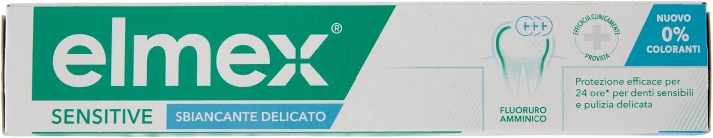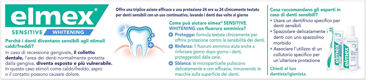 Elmex Sensitive Whitening toothpaste with amino fluoride is a specific toothpaste for the daily protection of sensitive teeth. Elmex Sensitive Whitening offers effective triple action and clinically proven 24-hour protection for sensitive teeth with continuous use, brushing your teeth twice daily. In addition, its cleaning formula gently and effectively removes stains, helping to restore the natural whiteness of teeth.