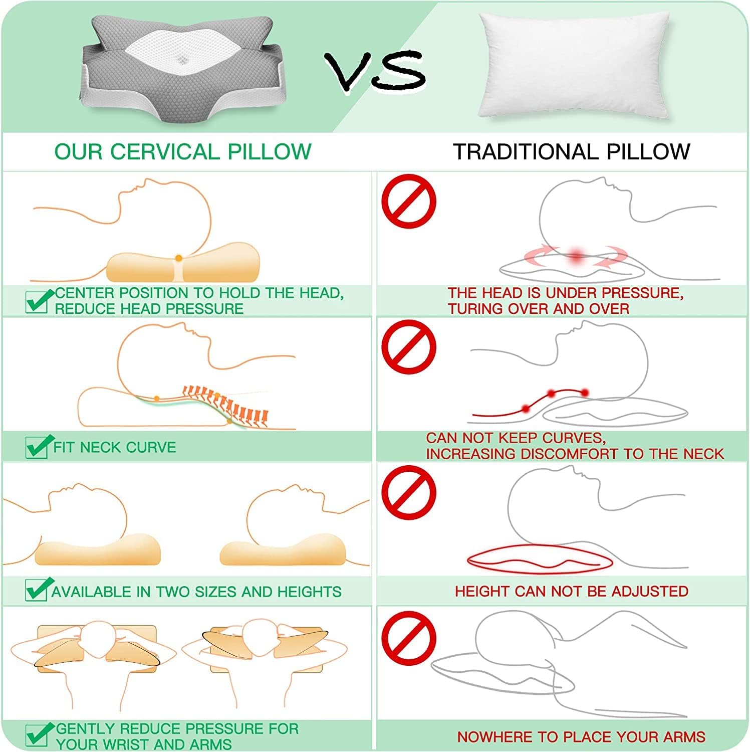 🌙TWO HEIGHTS—DESIGNED FOR BACK & SIDE SLEEPING: Size 64L*38W*(12.5/10.5)H cm. Back sleepers with cervical issues can sleep on the higher side (12.5cm) of the pillow with 2 horns as this side provides better support for the head and cervical, so as to keeps your neck properly aligned with the rest of your body. All the other back/side sleepers can sleep on the lower side (10.5cm).