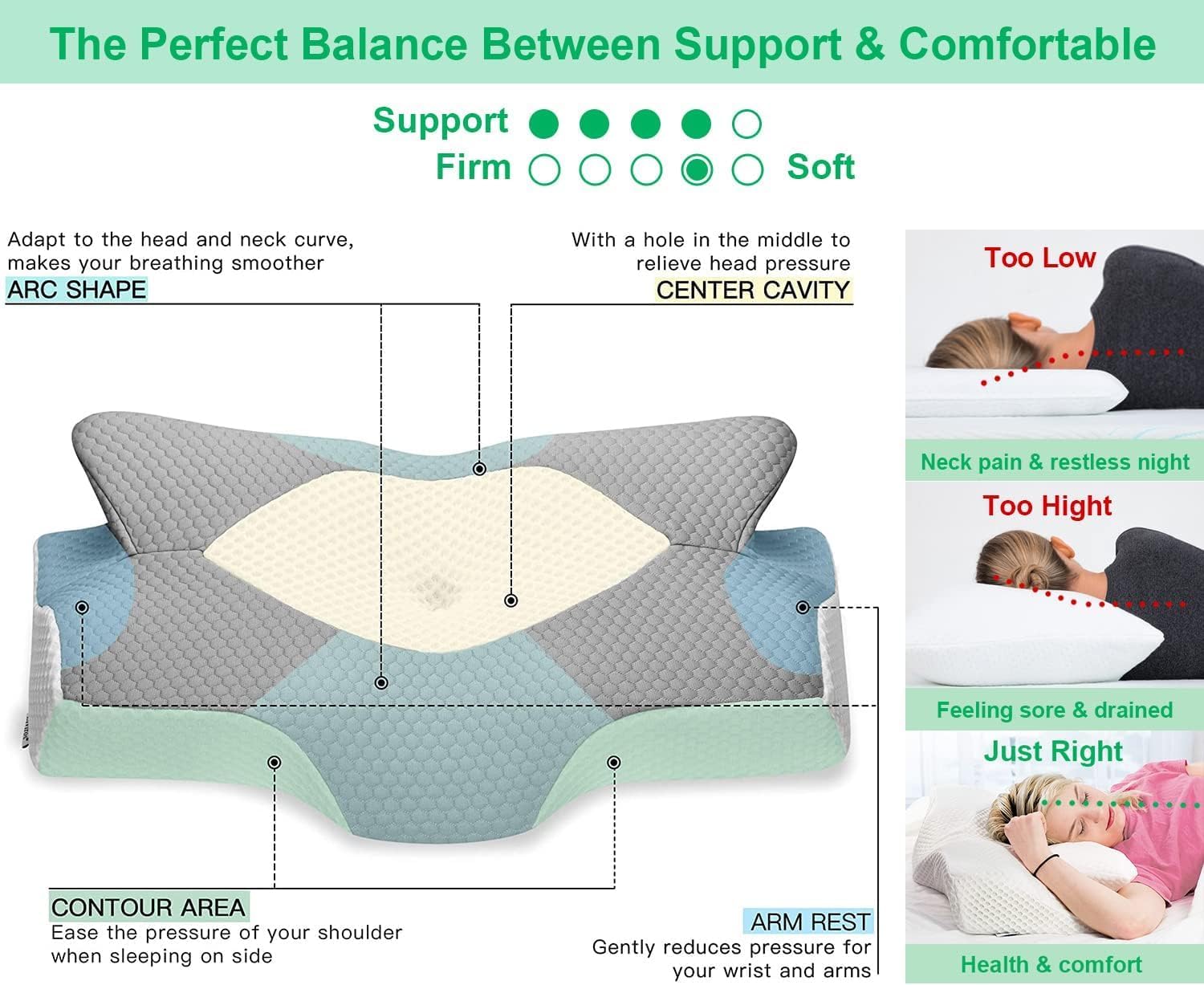 🌙REDUCE NECK & BACK PAIN: Proven contour design perfectly supports and aligns your head, neck, shoulder, and back. The slope keeps your head from rolling out of a stable position. Bringing a reduction of stress in the cervical vertebra and spine. Improving sleep and relieving neck and shoulder pain, discomfort rejuvenating your body.