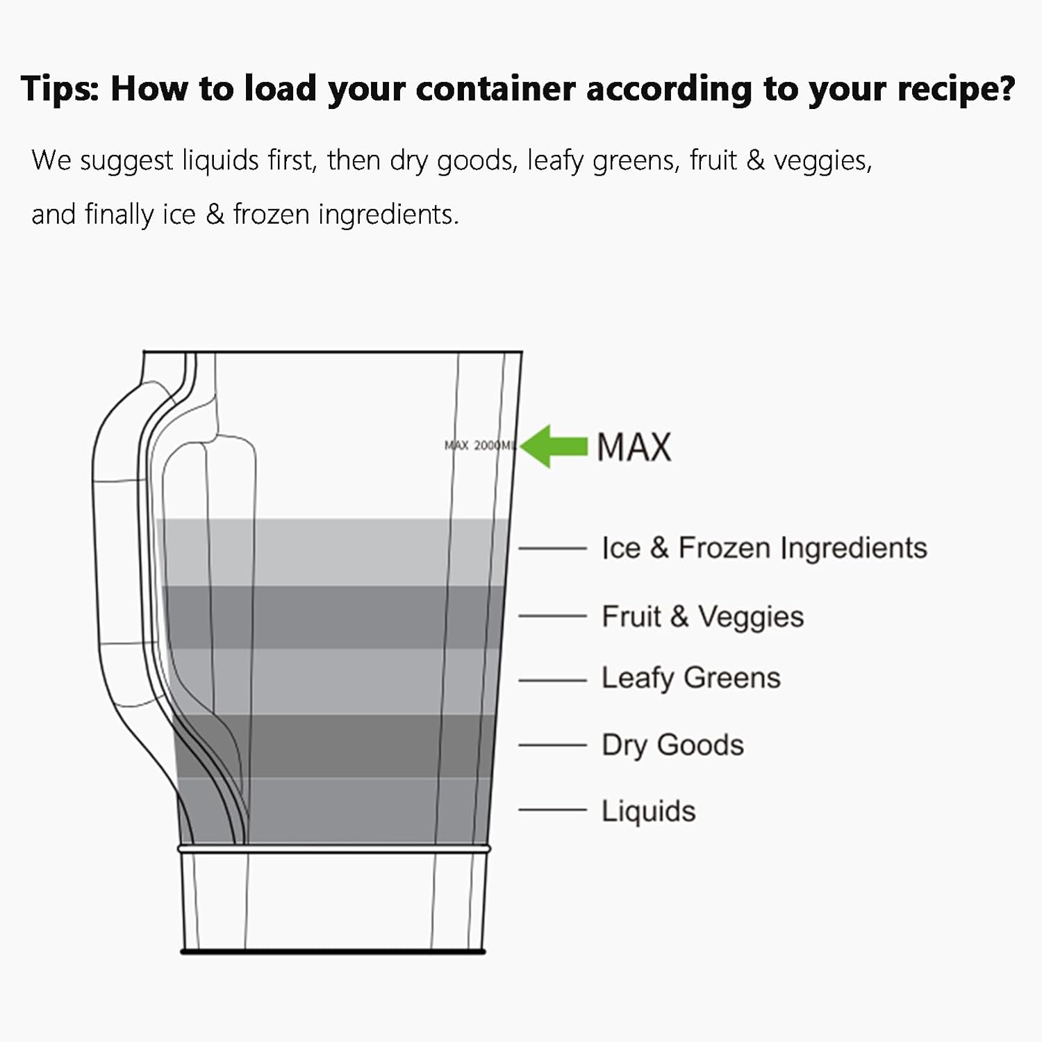 Powerful & High-Speed Blender: This blender smoothie maker is equipped with a powerful 2000W motor, more powerful than a lot of blenders on the market, and works at up to 33,000 r/min, with 8 SUS 304 high-quality sharp blades. Blenders for the kitchen can instantly hard food such as nuts and seeds, to achieve the blending effect while retaining the original nutrition of the food without affecting the taste. Single-use time should not exceed 30S to avoid motor overheating.