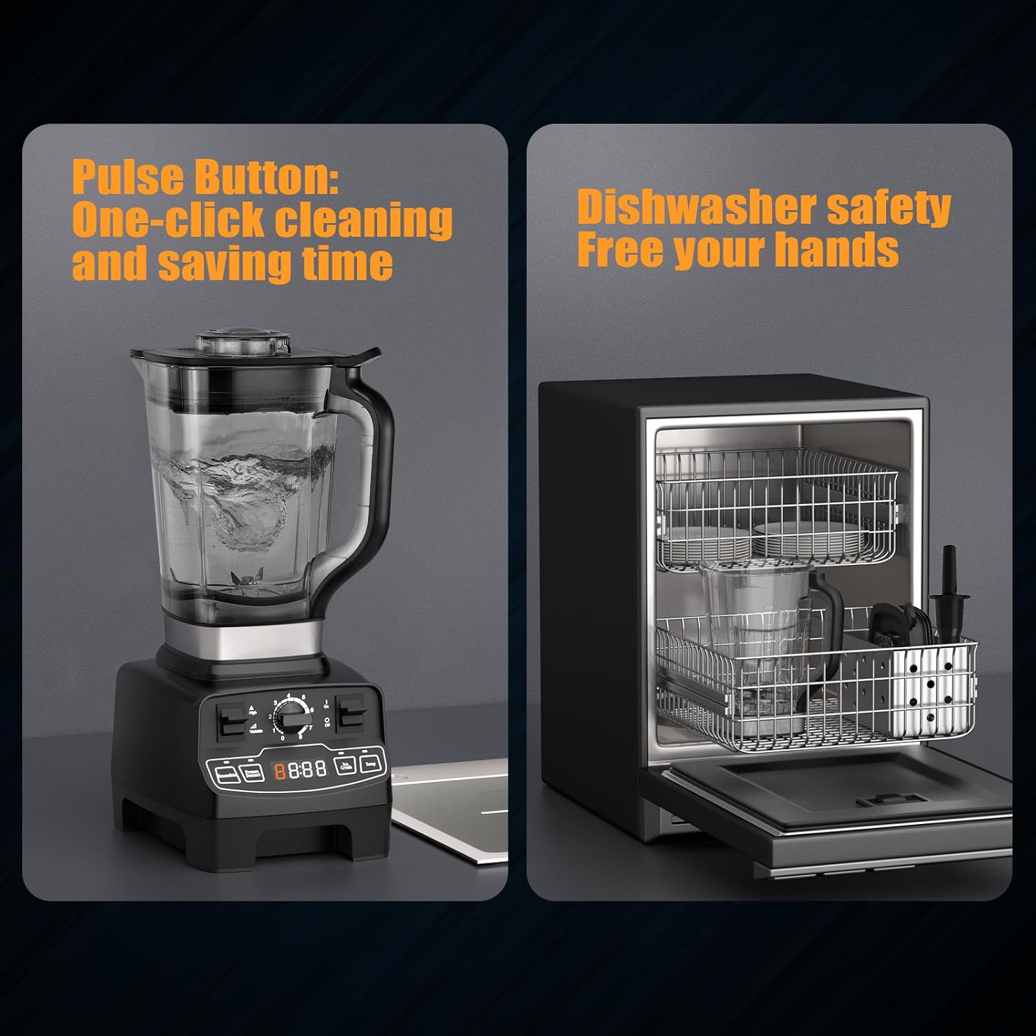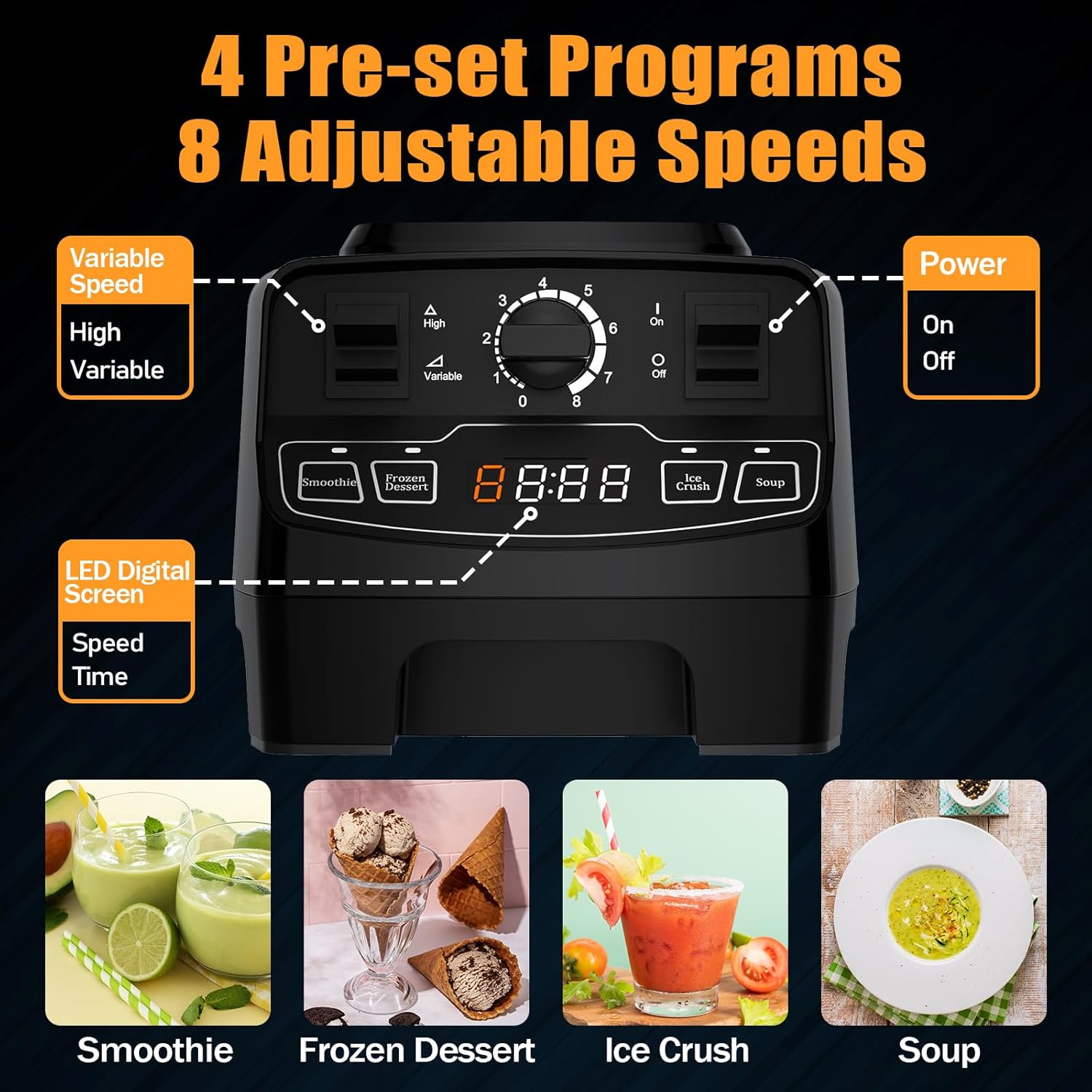 8-Speed Adjustments and 4 Presets: The jug blender is equipped with 8 variable speed controls to choose as you go, depending on the desired food fineness, and a professional blender improves the precision of your cooking to perfect every texture of food, allowing you to cook without limitations. In addition, you can customize the recipe program smoothies/ice cubes/frozen desserts/soups according to the programmed settings) The blenders for kitchen will excel in every type of cuisine.