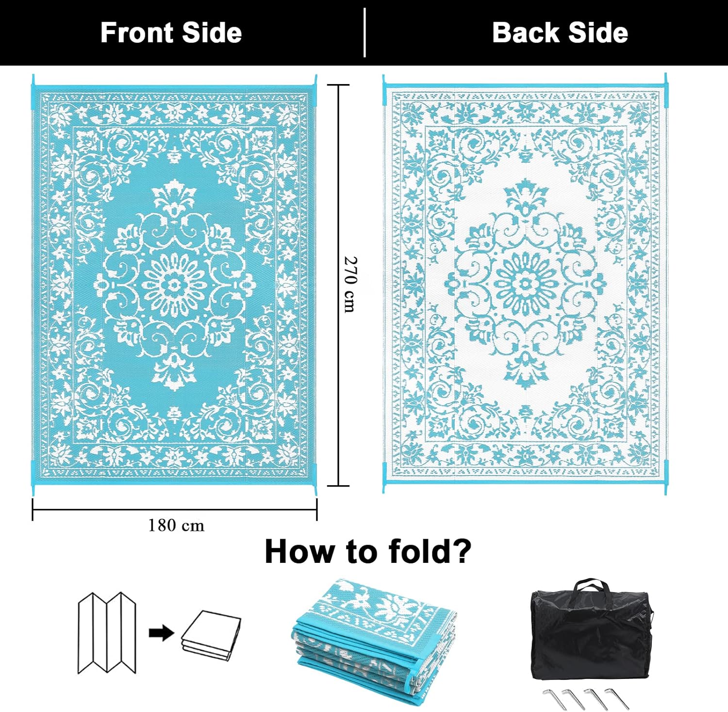 【Easy Cleaning & UV Fade Resistant】:The patio rug is easy to be cleaned, simply spray with a hose or sweep away dirt with water and airing it dry. Not accumulation water and easy to dry. UV coated design totally prevents the damages from ultraviolet and high temperature. But do not leave in direct sunlight for extended periods, use it in the shade to make the camping rug more durable.