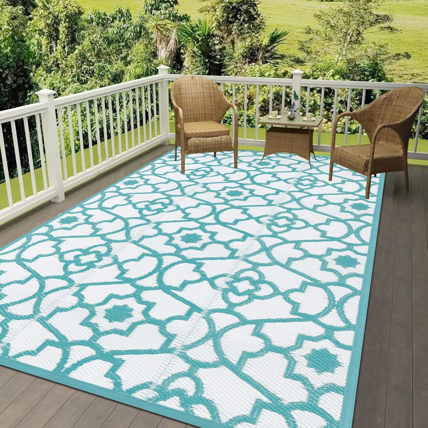 【Easy Cleaning & UV Fade Resistant】:The garden rug is easy to be cleaned, simply spray with a hose or sweep away dirt with water and airing it dry. Not accumulation water and easy to dry. UV coated design totally prevents the damages from ultraviolet and high temperature. But do not leave in direct sunlight for extended periods, use it in the shade to make the camping rug more durable.