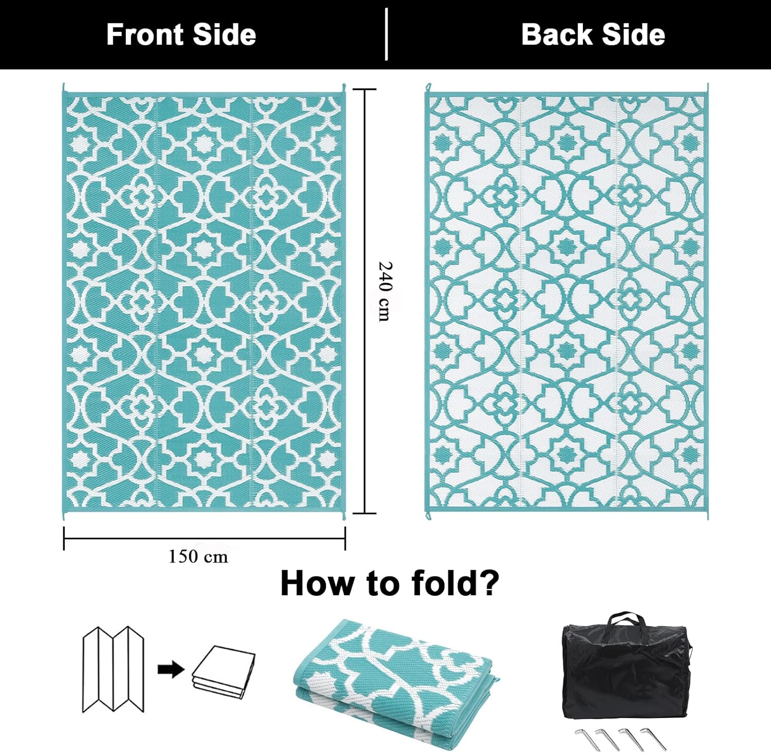 【Portable & Easy to Store】:Enyhom plastic woven outdoor rug is made of lightweight material that can be folded into compact size for storage. The patio rug comes with a durable oxford cloth storage bag for carry convenience. Apart from that, every rug has 4 stakes for pressing rug on ground which make sure your rugs keep stable in windy day.