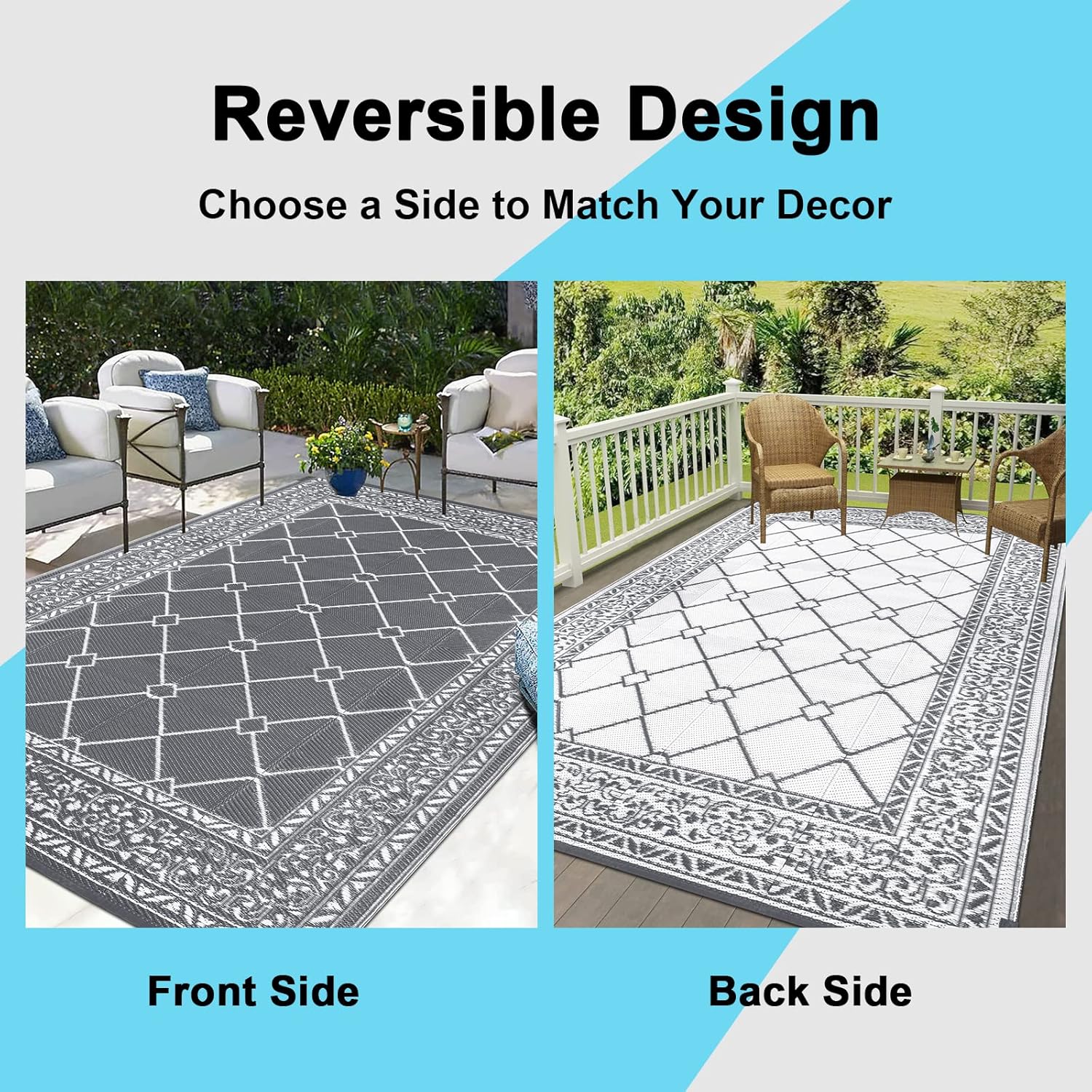 【Decorative and Reversible】: This outdoor area rug is reversible, two-sided design allows you to have two different looks. If one side got sticky stains, or you get tired of the pattern, just flip it over for a different look. Get two ravishing indoor outdoor rug in one price.