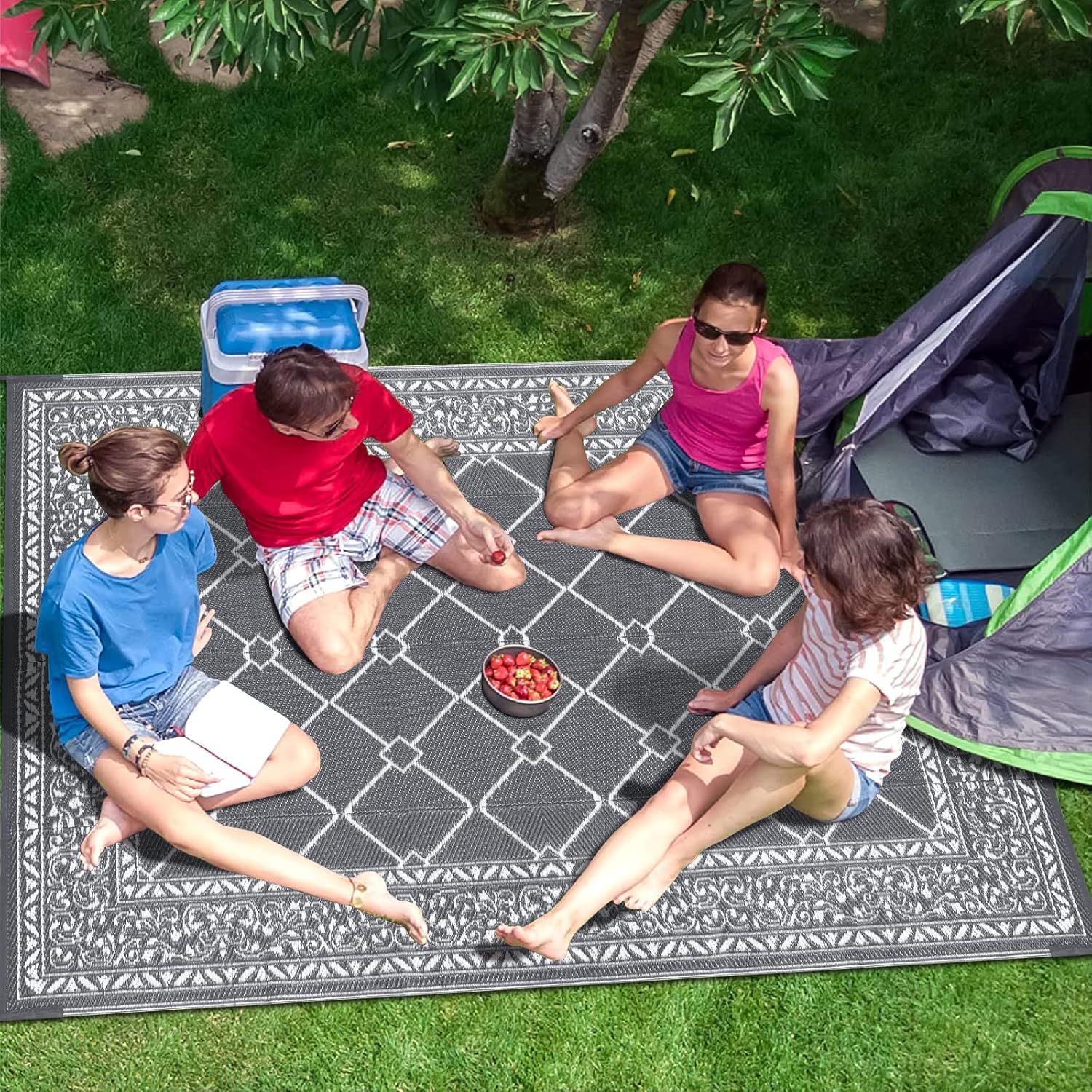 【Easy Cleaning & UV Fade Resistant】:The garden rug is easy to be cleaned, simply spray with a hose or sweep away dirt with water and airing it dry. Not accumulation water and easy to dry. UV coated design totally prevents the damages from ultraviolet and high temperature. But do not leave in direct sunlight for extended periods, use it in the shade to make the camping rug more durable.