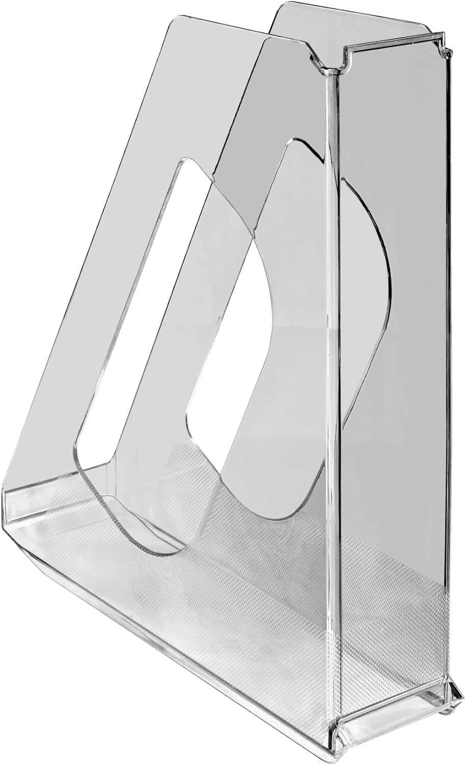 A modern magazine file made from high quality robust plastic, with a stylish design, transparent finish and a unique textured base