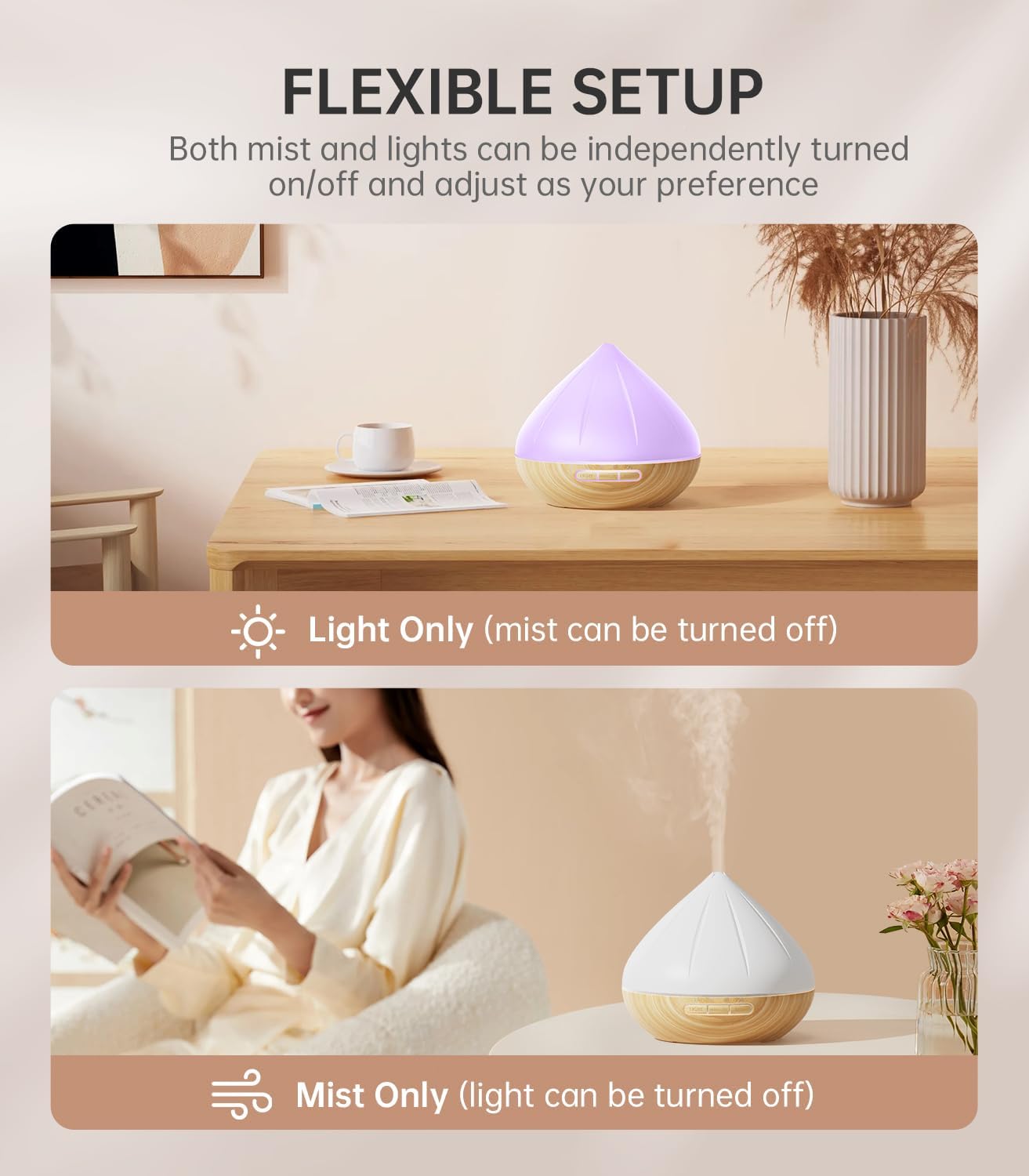 ✿ FLEXIBLE SETUP – The use of our aromatherapy diffuser is very flexible, the light and mist can be switched on or off and adjusted individually. You can choose to turn on the lights and scent as an aromatherapy diffuser, or use it as a humidifier without essential oils, as well as turn on only the lights as a nightlight. All settings depend on your preference.